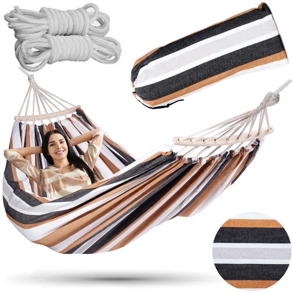 Hamak ogrodowy EDEN SAND w paskiModel: EDEN | Kolor: SAND Niesamowity relaks w Twoim ogrodzie!Hamak ogrodowy Eden to idealne połączenie komfortu i trwałości, zaprojektowane dla dwóch osób. Dzięki maksymalnemu obciążeniu do 200 kg, solidnej konstrukcji oraz linkom z drążkami stabilizującymi, zapewnia stabilność i bezpieczeństwo użytkowania. W zestawie znajdują się linki do przywiązania i pokrowiec, co umożliwia łatwe montowanie i przechowywanie. Materiał wykonania to wytrzymałe połączenie 65% bawełny i 35% poliestru, zapewniające komfort, a drewniane drążki stabilizujące dodają estetyki oraz równomiernie rozkładają ciężar, zwiększając komfort użytkowania. Hamak Eden jest doskonałym wyborem dla każdego, kto ceni sobie relaks na świeżym powietrzu w otoczeniu natury. ☀️ Cechy produktu:✅ Duży rozmiar dwuosobowy: Hamak Eden oferuje przestronne miejsce do wspólnego relaksu dla dwóch osób.✅ Maksymalne obciążenie do 200 kg: Solidna konstrukcja hamaka zapewnia bezpieczeństwo i wytrzymałość, umożliwiając wspólny wypoczynek bez obaw.✅ Linki z drążkami stabilizującymi: Drążki stabilizujące zapobiegają zaplątaniu się linek i zwiększają stabilność konstrukcji, co przekłada się na wygodę użytkowania.✅ Zestaw zawiera linki do przywiązania oraz pokrowiec: Ułatwia montaż w wybranym miejscu oraz przechowywanie i transport hamaka, zapewniając jego długotrwałe użytkowanie.✅ Materiał wykonania: 65% bawełna i 35% poliester: Wytrzymała mieszanka materiałów łączy komfort bawełny z odpornością poliestru.✅ Drewniane drążki stabilizujące: Nie tylko zwiększają estetykę hamaka, ale także rozkładają ciężar równomiernie, co zwiększa komfort leżenia. Wymiary produktuDługość całkowita: 260 cmDługość materiału: 200 cmSzerokość materiału: 150 cmPałąk drewniany: 40 cm Informacje dodatkowePrzedstawione kolory należy traktować poglądowo - mogą odbiegać od rzeczywistych ze względu na różne ustawienia monitorów oraz proces obróbki zdjęć. Rzeczywiste wymiary mogą się różnić od podanych wyżej. Tolerancja błędów może wynosić +/- 5%. Marka:eHokeryKod produktu:063523MGKod EAN:5905523063523Kolor:sandSzerokość materiału: 150 cmDługość materiału:200 cmMateriał:bawełna + poliesterMaksymalne obciążenie:200 kgPrzeznaczenie:ogród | plaża | działka | taras | balkon | kempingDrążki stabilizujące w zestawie:tak