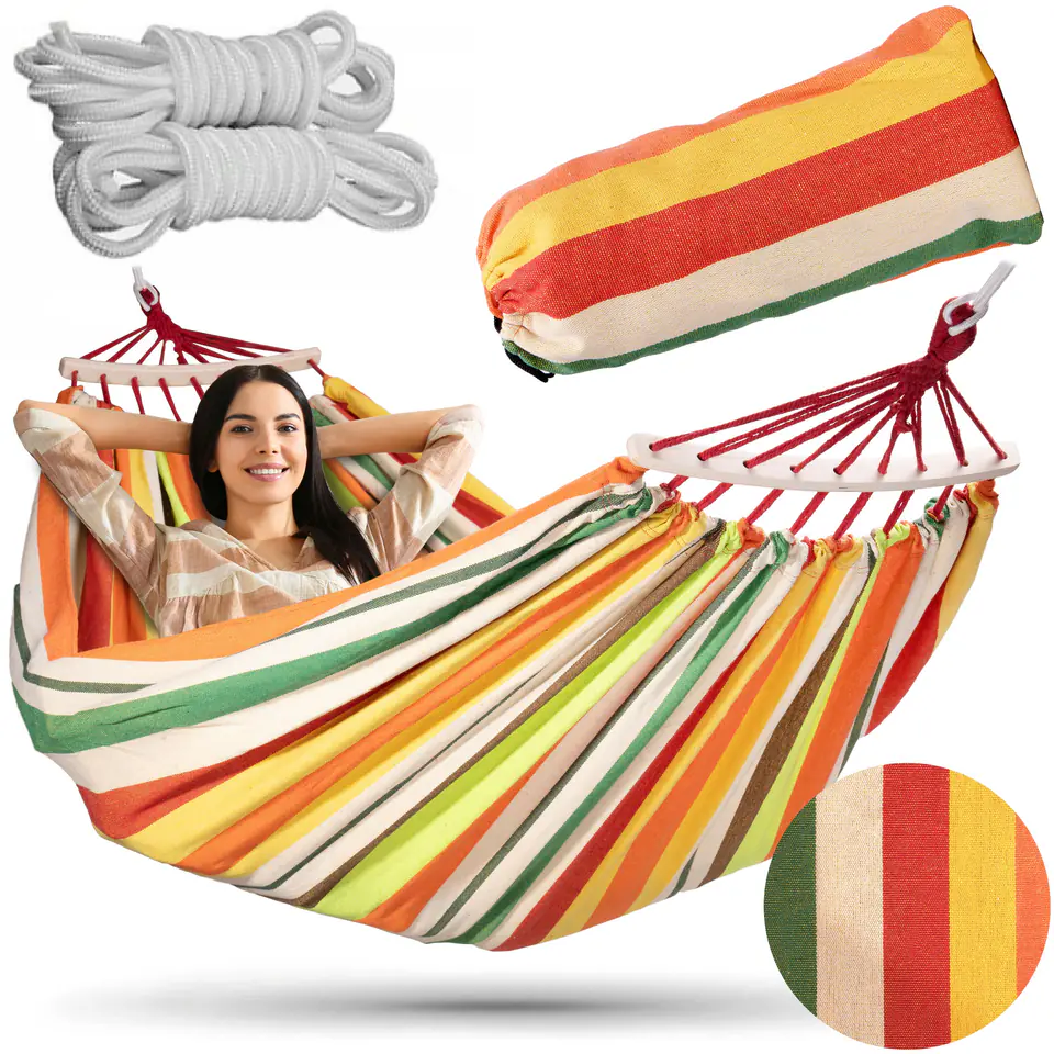 Hamak ogrodowy EDEN SUMMER w paskiModel: EDEN | Kolor: SUMMER Niesamowity relaks w Twoim ogrodzie!Hamak ogrodowy Eden to idealne połączenie komfortu i trwałości, zaprojektowane dla dwóch osób. Dzięki maksymalnemu obciążeniu do 200 kg, solidnej konstrukcji oraz linkom z drążkami stabilizującymi, zapewnia stabilność i bezpieczeństwo użytkowania. W zestawie znajdują się linki do przywiązania i pokrowiec, co umożliwia łatwe montowanie i przechowywanie. Materiał wykonania to wytrzymałe połączenie 65% bawełny i 35% poliestru, zapewniające komfort, a drewniane drążki stabilizujące dodają estetyki oraz równomiernie rozkładają ciężar, zwiększając komfort użytkowania. Hamak Eden jest doskonałym wyborem dla każdego, kto ceni sobie relaks na świeżym powietrzu w otoczeniu natury. ☀️ Cechy produktu:✅ Duży rozmiar dwuosobowy: Hamak Eden oferuje przestronne miejsce do wspólnego relaksu dla dwóch osób.✅ Maksymalne obciążenie do 200 kg: Solidna konstrukcja hamaka zapewnia bezpieczeństwo i wytrzymałość, umożliwiając wspólny wypoczynek bez obaw.✅ Linki z drążkami stabilizującymi: Drążki stabilizujące zapobiegają zaplątaniu się linek i zwiększają stabilność konstrukcji, co przekłada się na wygodę użytkowania.✅ Zestaw zawiera linki do przywiązania oraz pokrowiec: Ułatwia montaż w wybranym miejscu oraz przechowywanie i transport hamaka, zapewniając jego długotrwałe użytkowanie.✅ Materiał wykonania: 65% bawełna i 35% poliester: Wytrzymała mieszanka materiałów łączy komfort bawełny z odpornością poliestru.✅ Drewniane drążki stabilizujące: Nie tylko zwiększają estetykę hamaka, ale także rozkładają ciężar równomiernie, co zwiększa komfort leżenia. Wymiary produktuDługość całkowita: 260 cmDługość materiału: 200 cmSzerokość materiału: 150 cmPałąk drewniany: 40 cm Informacje dodatkowePrzedstawione kolory należy traktować poglądowo - mogą odbiegać od rzeczywistych ze względu na różne ustawienia monitorów oraz proces obróbki zdjęć. Rzeczywiste wymiary mogą się różnić od podanych wyżej. Tolerancja błędów może wynosić +/- 5%. Marka:eHokeryKod produktu:063301MGKod EAN:5905523063301Kolor:summerSzerokość materiału: 150 cmDługość materiału:200 cmMateriał:bawełna + poliesterMaksymalne obciążenie:200 kgPrzeznaczenie:ogród | plaża | działka | taras | balkon | kempingDrążki stabilizujące w zestawie:tak