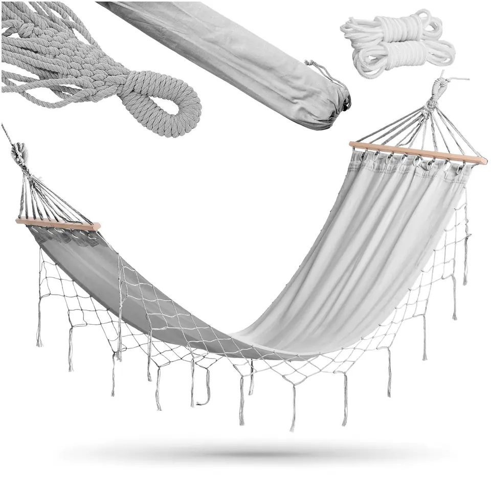 Hamak ogrodowy PARADISO szary z chwostamiModel: PARADISO | Kolor: SZARY Niesamowity relaks w Twoim ogrodzie!Hamak ogrodowy Paradiso to idealne połączenie komfortu i trwałości. Dzięki maksymalnemu obciążeniu do 120 kg, solidnej konstrukcji oraz linkom z drążkami stabilizującymi, zapewnia stabilność i bezpieczeństwo użytkowania. W zestawie znajdują się linki do przywiązania i pokrowiec, co umożliwia łatwe montowanie i przechowywanie.Materiał wykonania to wytrzymałe połączenie 70% bawełny i 30% poliestru, zapewniające komfort, a drewniane drążki stabilizujące dodają estetyki oraz równomiernie rozkładają ciężar, zwiększając komfort użytkowania.Hamak Paradiso jest doskonałym wyborem dla każdego, kto ceni sobie relaks na świeżym powietrzu w otoczeniu natury. ☀️ Cechy produktu:✅ Duży rozmiar: Hamak Paradiso oferuje przestronne miejsce do relaksu✅ Maksymalne obciążenie do 120 kg: Solidna konstrukcja hamaka zapewnia bezpieczeństwo i wytrzymałość, umożliwiając wypoczynek bez obaw.✅ Linki z drążkami stabilizującymi: Drążki stabilizujące zapobiegają zaplątaniu się linek i zwiększają stabilność konstrukcji, co przekłada się na wygodę użytkowania.✅ Zestaw zawiera linki do przywiązania oraz pokrowiec: Ułatwia montaż w wybranym miejscu oraz przechowywanie i transport hamaka, zapewniając jego długotrwałe użytkowanie.✅ Materiał wykonania: 70% bawełna i 30% poliester: Wytrzymała mieszanka materiałów łączy komfort bawełny z odpornością poliestru.✅ Drewniane drążki stabilizujące: Nie tylko zwiększają estetykę hamaka, ale także rozkładają ciężar równomiernie, co zwiększa komfort leżenia. ✔️Wymiary produktuDługość całkowita: 300 cmDługość materiału: 200 cmSzerokość materiału: 100 cmPałąk drewniany: 80 cm Informacje dodatkowePrzedstawione kolory należy traktować poglądowo - mogą odbiegać od rzeczywistych ze względu na różne ustawienia monitorów oraz proces obróbki zdjęć. Rzeczywiste wymiary mogą się różnić od podanych wyżej. Tolerancja błędów może wynosić +/- 5%. Marka:eHokeryKod produktu:063349MGKod EAN:5905523063349Kolor:szarySzerokość materiału: 100 cmDługość materiału:200 cmMateriał:bawełna + poliesterMaksymalne obciążenie:120 kgPrzeznaczenie:ogród | plaża | działka | taras | balkon | kempingDrążki stabilizujące w zestawie:tak