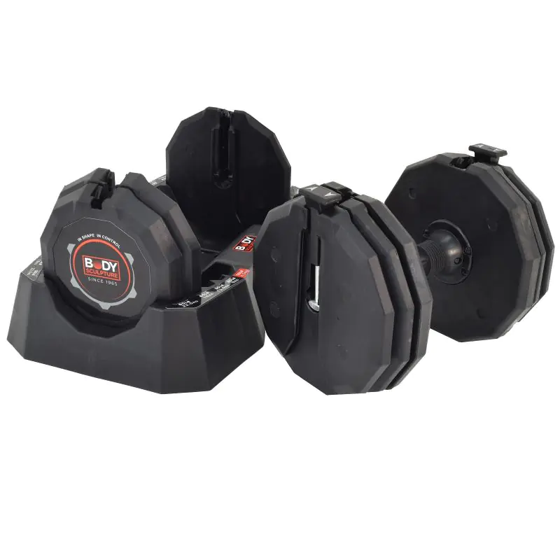Hantel regulowany Body Sculpture BW 7922Hantle regulowane to idealny element wyposażenia Twojej domowej siłowni. Dzięki nim zaoszczędzasz miejsce, czas i pieniądze. Zamiast kupować kilka par hantli o różnej wadze, wystarczy, że zainwestujesz raz. Wystrczy jeden zestaw aby wykonać zróżnicowany trening różnych partii mięśni we własnym domu.Hantel regulowany BW 7922 marki Body Sculpture został zaprojektowany tak, by wykonywany trening siłowy był jak najbardziej optymalny dla naszego organizmu. Z łatwością zmienisz obciążenie, z jakim chcesz ćwiczyć, co sprawia, że unikasz przedłużonych przerw poświęconych na dokładanie lub odejmowanie ciężaru. Z hantlem regulowanym przerwy pomiędzy ćwiczeniami możesz wykorzystać w pełni na odpoczynek i zebranie sił przed zbliżającym się wysiłkiem.Wagę hantli możesz ustawić na jednym z pięciu poziomów: 4,5 kg; 9 kg; 13,5 kg; 18 kg i 22,5 kg. W zestawie znajduje się podstawka, dzięki której obciążniki bezpiecznie utrzymasz w porządku.Dane techniczne: