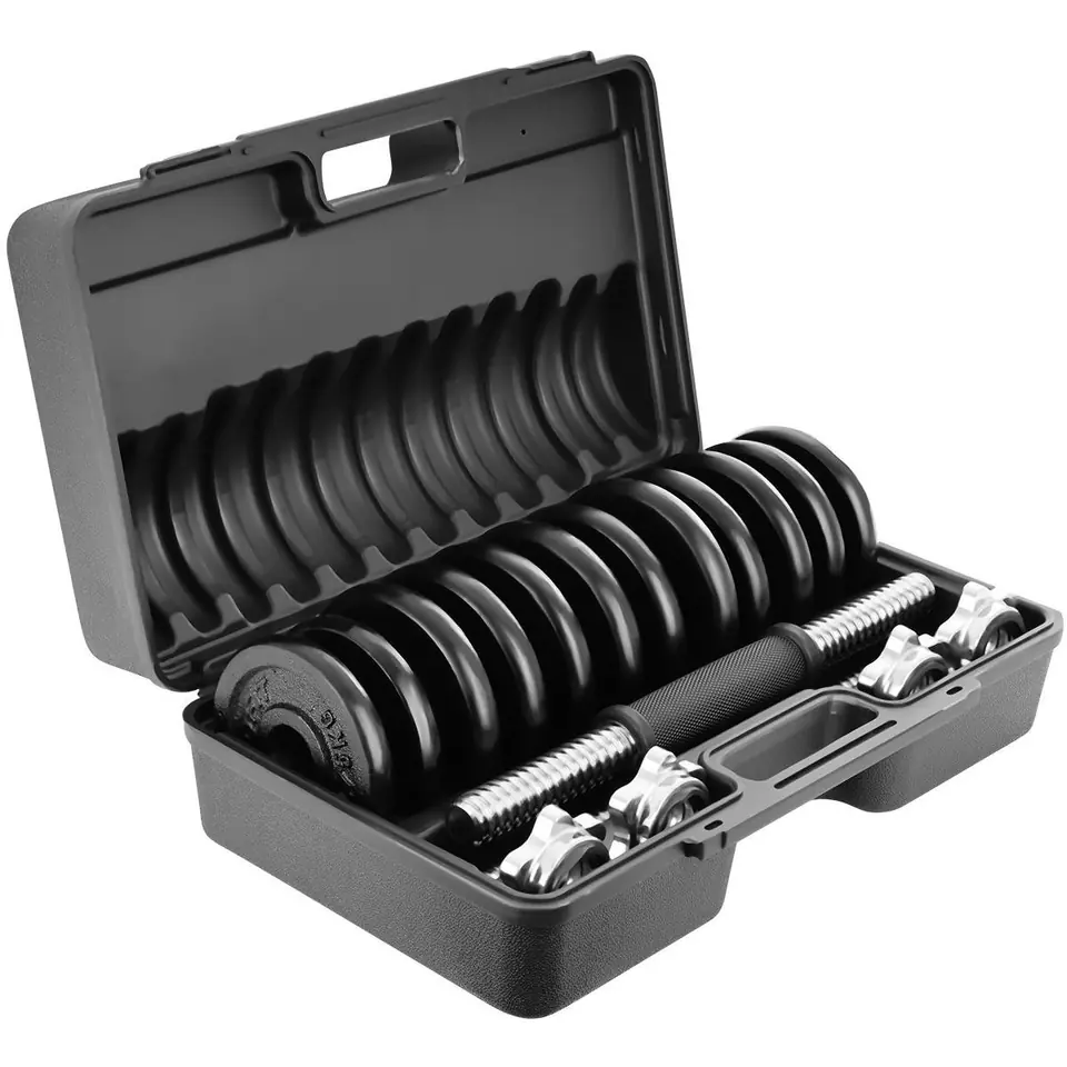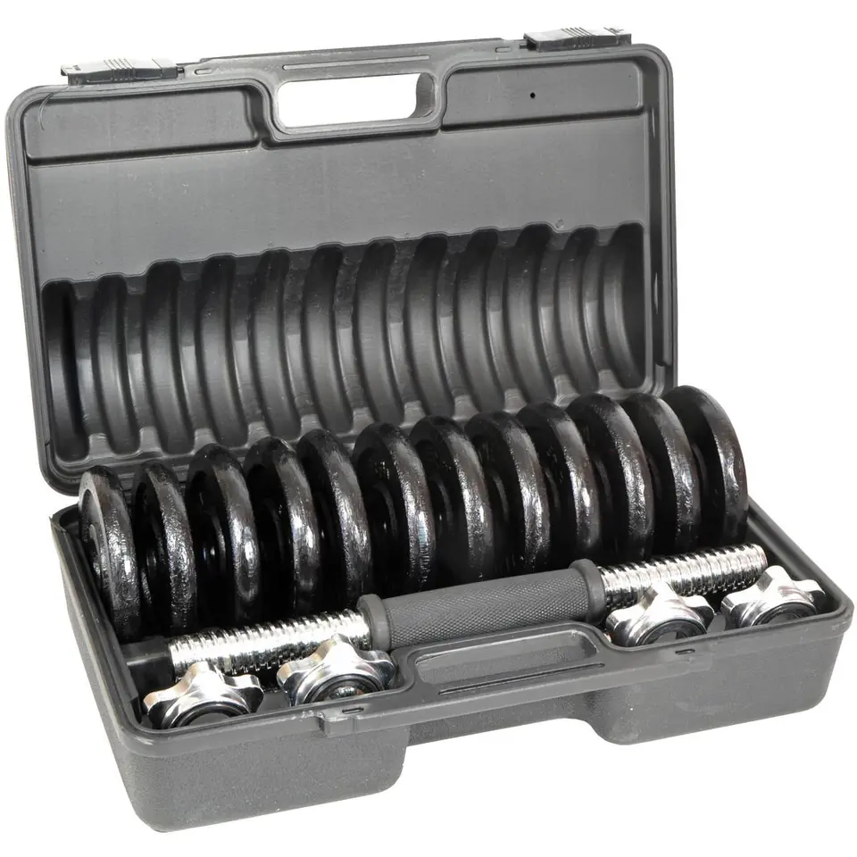 Cały zestaw czyli dwie hantle, 12 talerzy, nakrętki (zaciski) zostały spakowane w wygodna do transportu i przechowywania walizkę.