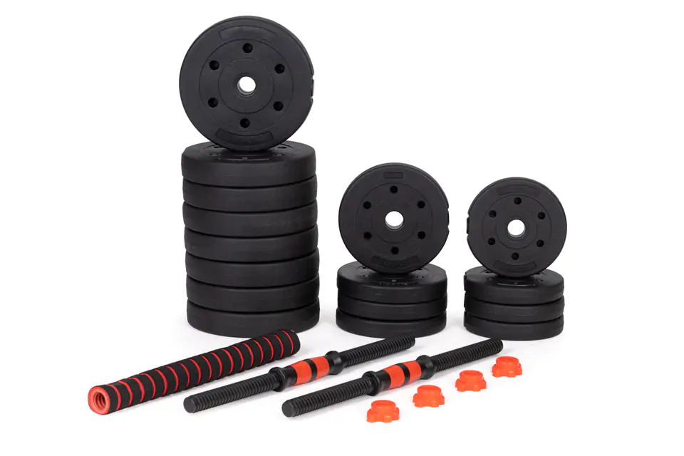 W skład zestawu wchodzi 16 talerzy, dzięki którym można dostosować ciężar do wykonywanego treningu. Uchwyt hantli jest wyprofilowany i zapewnia mocny chwyt podczas wykonywanych ćwiczeń.