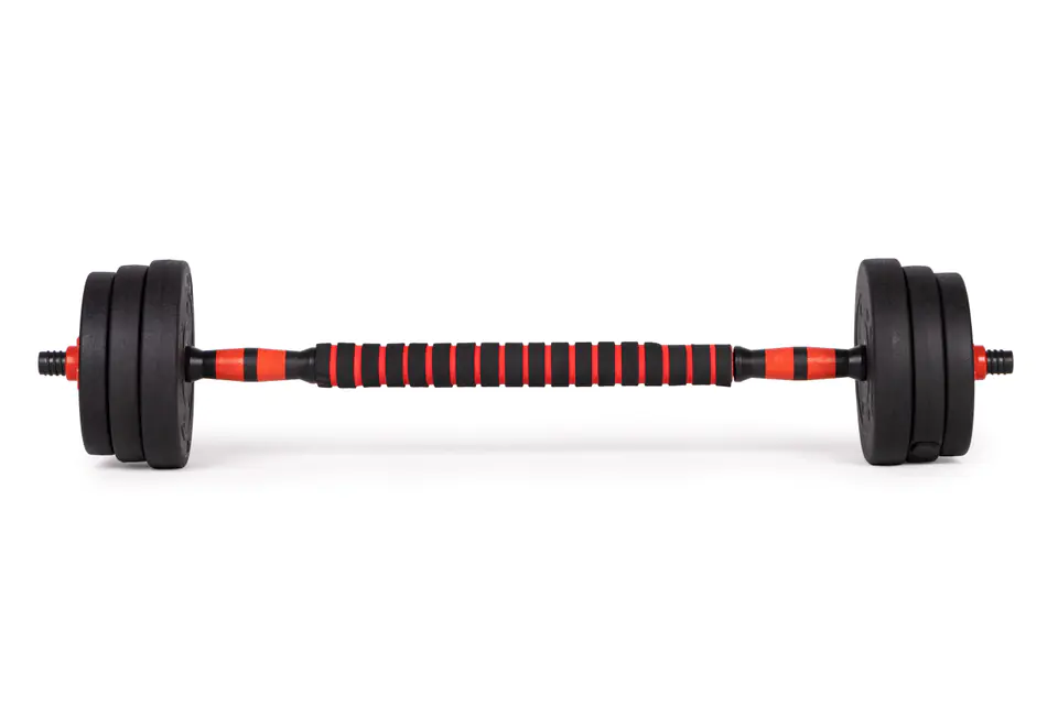 W zestawie znajduje się specjalny gryf, który po zmontowaniu z dwoma hantlami tworzy funkcjonalną sztangę.