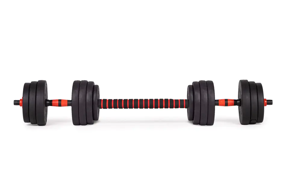 W zestawie znajduje się specjalny gryf, który po zmontowaniu z dwoma hantlami tworzy funkcjonalną sztangę. Takie rozwiązanie umożliwia trening jednym, większym ciężarem i aktywuje dodatkowe partie mięśni podczas ćwiczeń.