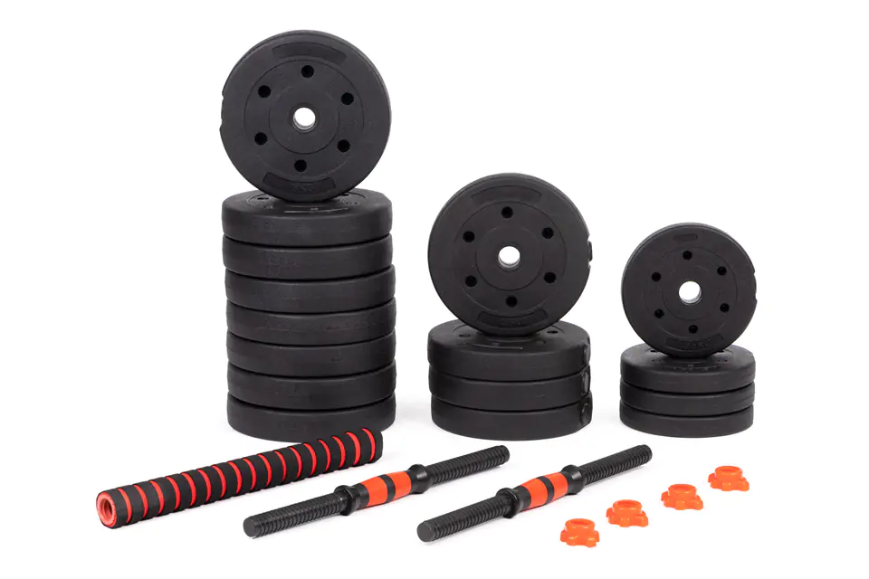 W skład zestawu wchodzi 16 talerzy, dzięki którym można dostosować ciężar do wykonywanego treningu. Uchwyt hantli jest wyprofilowany i zapewnia mocny chwyt podczas wykonywanych ćwiczeń.