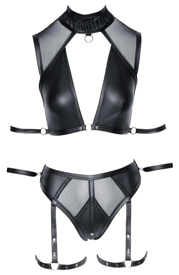 Seksowny komplet bielizny Cottelli Bondage. Top i figi wykonane z pięknego, matowego materiału z przezroczystymi wstawkami z siateczki. Bardzogłeboko wycięty top z wysokim kołnierzem, z ozdobnym pierścieniem z przodu i zapięciem na zatrzaski. Tył prawie całkowicie odkryty. Po obu stronach znajduje się pierścień z ogranicznikami dla ramion. Figi w okolicach krocza zapinane na zatrzaski. Po obu stronach (przy figach i topie) znajdują się pierścienie kajdanek na ręce. Paski na udach oraz kajdanki są odpinane.