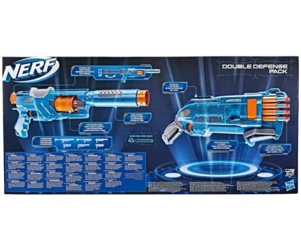- Zawartość zestawu: 2 blastery, 1 demontowalny trzon, 1 demontowalna lufa, 40 piankowych strzałek Nerf Elite