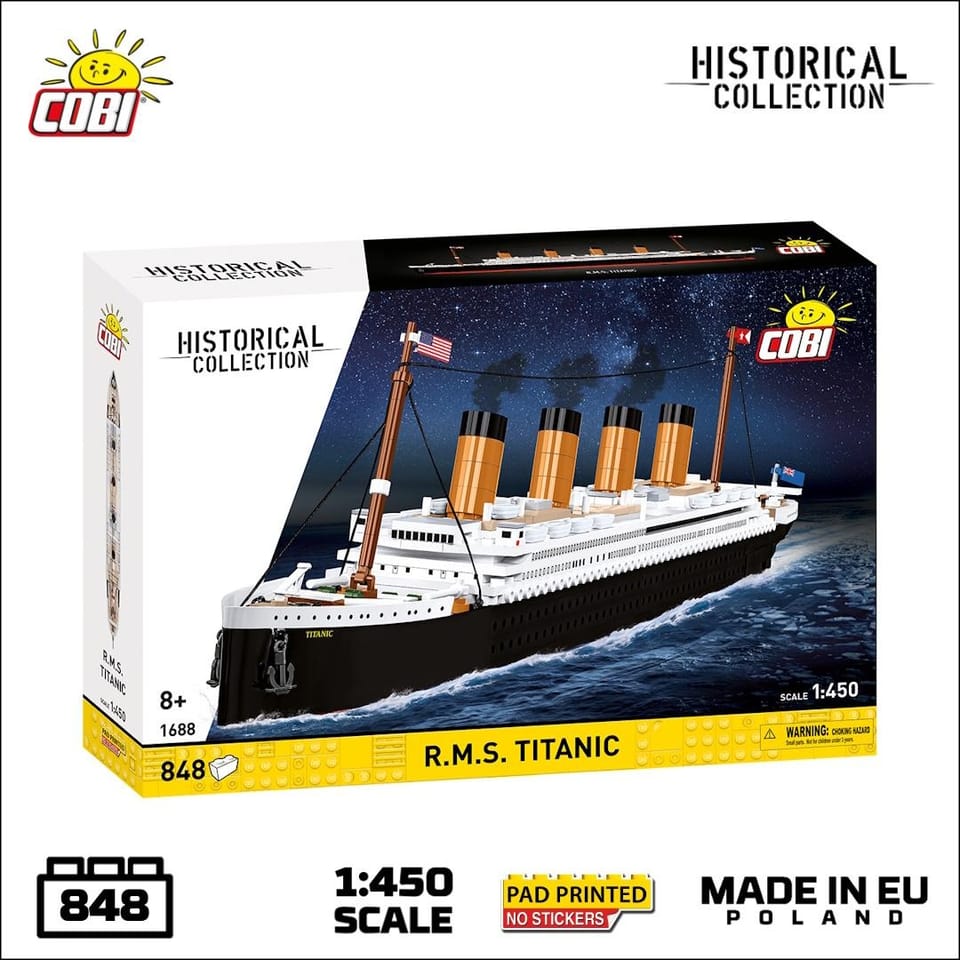 Legendarny pierwszy i... ostatni rejs!Słynny brytyjski transatlantyk już przed swoją pierwszą podróżą imponował rozmiarami. Miał 268,99 metra długości i aż 29,41 metra szerokości. Był prawdziwym cudem techniki początku XX wieku, łączącym luksus, nowoczesne rozwiązania i majestatyczny wygląd.Podczas swojego pierwszego, dziewiczego rejsu, w nocy z 14 na 15 kwietnia 1912 roku, na trasie Southampton - Cherbourg - Queenstown - Nowy Jork, R.M.S. Titanic zderzył się z górą lodową i zatonął. Ta tragiczna katastrofa stała się jedną z najsłynniejszych w historii żeglugi i do dziś budzi ogromne emocje oraz fascynację.Ten zestaw klocków pozwala odtworzyć legendarny statek w najdrobniejszych szczegółach i przenieść się w czasie, by poznać tajemnice prawdziwej legendy.Dlaczego ten model jest wyjątkowy?Kompaktowa skala - Pomimo skali 1:450 model zachowuje wszystkie charakterystyczne cechy Titanica. Każdy detal, od kominów po drobne elementy pokładu, został dopracowany tak, aby zapewnić realistyczny i imponujący wygląd.