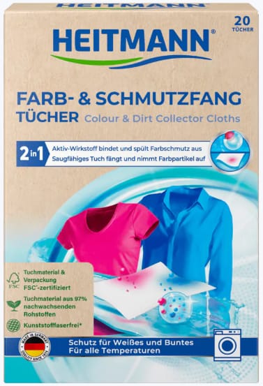 Nie ryzykuj przebarwień i zniszczeń tkanin. Wypróbuj Heitmann Chusteczki Wyłapujące Kolor i Brud i ciesz się nieskazitelnym efektem każdego prania!
