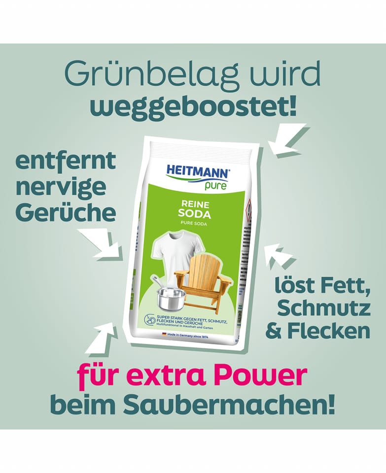 Produkt świetnie sprawdza się również na zewnątrz, gdzie pomaga usuwać zielone osady z kamiennych płyt, podjazdów i mebli ogrodowych. Jednoskładnikowa, naturalna formuła gwarantuje bezpieczeństwo i wysoką jakość działania.Zamów Heitmann Pure Reine Soda już dziś i odkryj siłę naturalnego sprzątania!