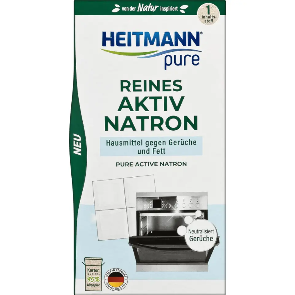 HEITMANN pure Czysta Aktywna Soda 350g to naturalny, mineralny środek czyszczący, który skutecznie usuwa tłuszcz, uporczywe plamy i nieprzyjemne zapachy. Dzięki zawartości jednego składnika . czystego wodorowęglanu sodu (minerał natryt) . jest bezpieczny dla środowiska i użytkownika. Idealnie sprawdza się przy czyszczeniu piekarników, płytek ceramicznych, kuchenek oraz naczyń do kawy i herbaty. Neutralizuje nieprzyjemne zapachy z desek do krojenia, bidonów czy butelek, a także odświeża wykładziny. Produkt został nagrodzony tytułem Top Marke 2022, co potwierdza jego wysoką jakość i skuteczność. Dodatkowo, opakowanie wykonane w 95% z makulatury świadczy o dbałości o środowisko. Stosowanie sody jest proste: wystarczy przygotować odpowiedni roztwór lub pastę i nanieść na zabrudzoną powierzchnię, a następnie spłukać wodą. Należy jednak pamiętać, że produkt nie nadaje się do spożycia.