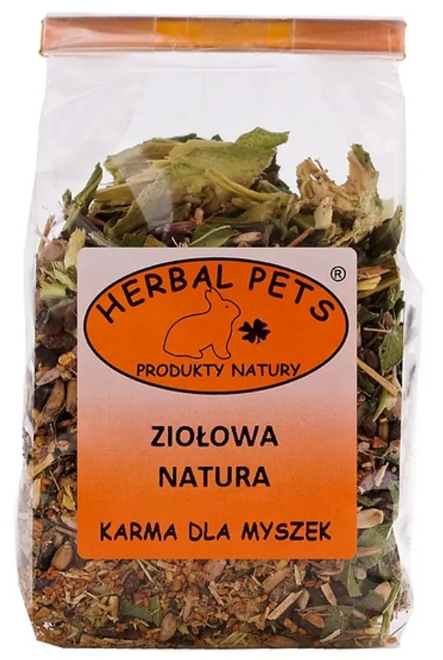 Ziołowa Natura - karma dla myszkiKarma stworzona na bazie ziół i warzyw stanowiących nie tylko naturalne przysmaki myszek, lecz również korzystnie wpływające na ich organizm.Mieszanka paszowa uzupełniająca dla myszek.Skład: nasiona ostropestu, lnianki i ogórecznika lekarskiego, słonecznik łuskany, korzeń cykorii, brokuł, ziele rdestu ptasiego.Składniki analityczne: białko surowe 15,3%, tłuszcz surowy 23,8%, włókno surowe 13,8%, popiół surowy 5,6%.