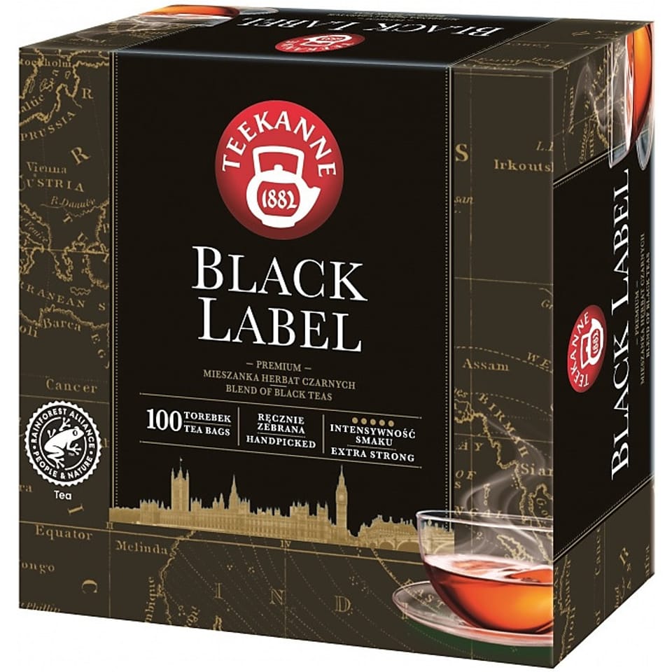* herbata TEEKANNE BLACK LABEL * wyjątkowa, pełna smaku mieszanka czarnych herbat prosto z południowo-wschodnich HIMALAJÓW * jeden z najważniejszych regionów uprawy herbaty na świecie, ASSAM * tropikalny klimat gwarantuje doskonałe warunki do wzrostu dla aromatycznej, intensywnej czarnej herbaty * starannie wyselekcjonowana z najlepszych plantacji oferuje najwyższą jakość i zapewnia wyjątkowo intensywne doznania smakowe * prowadzone od lat badania pokazują, że herbata posiada pozytywny wpływ na zdrowie * w związku z zawartą w niej kofeiną, herbata TEEKANNE BLACK LABEL może być zdrowszą alternatywą dla kawy * w opakowaniu: 100 torebek po 2 g herbaty * jednostka sprzedaży 1 opakowanie * TEEKANNE GMBH & CO. to niemiecka firma zajmująca się handlem herbatą z siedzibą w DÜSSELDORFIE - tradycja firmy sięga 1882 roku - założyciele RUDOLF ANDERS i EUGEN NISSLE jako pierwsi sprzedali herbatę w puszkach i herbaty już mieszane na wysokim poziomie jakościowym - co więcej, wynaleźli maszynową torebkę na herbatę - dziś ta rodzinna firma produkuje 7,5 miliarda torebek herbaty rocznie