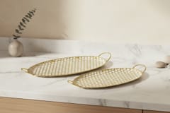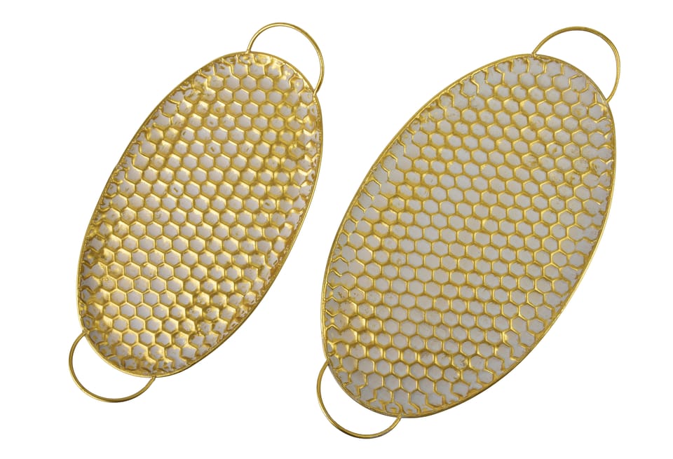 Komplet 2 tac dekoracyjnych HEXAGONE GLOWMateriał: metalKolor: złotyStyl: nowoczesny, glamour, geometrycznyPrzeznaczenie: dekoracyjne tace do ekspozycji świec, wazonów, figurek lub innych ozdób. Zestaw HEXAGONE GLOW obejmuje dwie eleganckie tace wykonane z metalu w złotym wykończeniu. Ich geometryczna forma przyciąga uwagę i dodaje aranżacjom nowoczesnego charakteru. Tace świetnie sprawdzą się jako baza do dekoracji stołu, komody czy stolika kawowego, podkreślając styl glamour lub modern i nadając wnętrzu luksusowego akcentu.XL:51X30X3CM (58cm z uchwytami) L: 45X24X3CM (52cm z uchwytami)