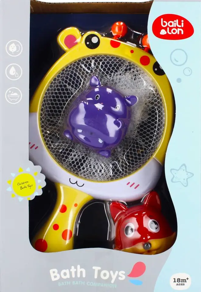 Zabawki hipopotama i lisa mają przyjazne buźki, po napełnieniu wodą za pomocą przyciśnięcia, możemy ją z nich wypuścić. Zabawki można wyławiać sitkiem do łowienie dołączonym do zestawu.