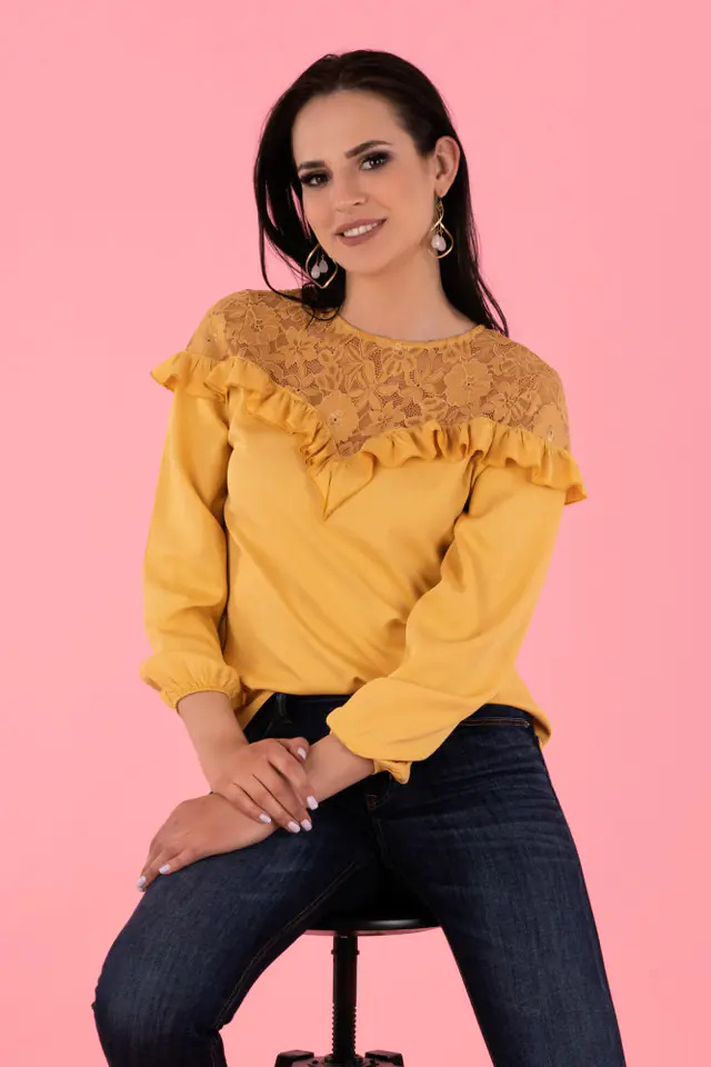 Bluzka z koronkowym wykończeniem na ramionach i falbanką.