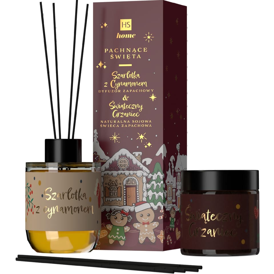 Szarlotka to zapach, który nie wymaga specjalnych okoliczności Zawsze świetnie "smakuje", pobudza zmysły, daje ukojenie i sygnał do zwolnienia tempa. Zapal świecę i delektuj się chwilą....pyszną i magiczną Wspaniały aromat dyfuzora wypełni pomieszczenie dzięki długim, naturalnym patyczkom z rattanu, które dla podtrzymania efektu dyfuzji należy co kilka dni odwrócić i zanurzyć w płynie suche końce. HISKIN HOME dyfuzor o zapachu Szarlotka grzaniec oraz sojowa świeca o tym samym aromacie, powstały z wykorzystaniem naturalnych olejków eterycznych.