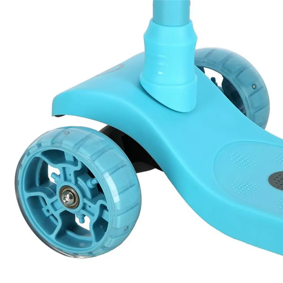 HLB09 to hulajnoga trójkołowa. Idealny sprzęt dla najmłodszych miłośników skatingu. Trzy kółka ułatwią naukę jazdy na hulajnodze i pozwalają nabrać wprawy. HLB09 posiada intuicyjny system sterowania. Kierownica służy głównie do utrzymywania równowagi, a manewry wykonujemy balansując i przechylając kierownicę w jedną lub drugą stronę. Takie rozwiązanie świetnie sprawdza się u najmłodszych pasjonatów jazdy. Dzięki regulowanej kierownicy łatwo dopasujemy sprzęt do wzrostu dziecka, pozwala to również cieszyć się hulajnogą przez dłuższy okres czasu. Hulajnoga wyposażona jest w hamulec nożny, który zwiększa bezpieczeństwo podczas jazdy, a wysoki komfort zapewnią łożyska klasy ABEC7. Kolejnym atutem HLB09 są świecące kółka oraz świecący deck. Zapewniają dużo radości dzieciom ale również powodują, że użytkownik jest bardziej widoczny. HLB09 to mała, lekka łatwa w rozłożeniu hulajnoga. Idealny sposób na sprawienie radości swojemu dziecku. Specyfikacja: Wymiary: Długość: 58 cm Szerokość: 32 cm Wysokość: 81 cm Wymiary po złożeniu: Długość: 58 cm Szerokość: 32 cm Wysokość: 16 cm Materiał: PP Aluminium Antypoślizgowy podest Wymiary podestu: Długość: 30 cm Szerokość: 13,5 cm Łożyska: ABEC 7 Kółka: Przednie: PU 120 mm, LED Tylne: PU 90 mm, LED Zakres regulacji kierownicy: 72,5 - 76,5 - 81 cm Maksymalna waga użytkownika: 50 kg Waga produktu: 2,2 kg Świecący deck Uwagi: Nie przeznaczona do użytku komercyjnego Zgodna z normą PN-EN 71-1:2014+A1:2018-08 Gwarancja 24 miesiące