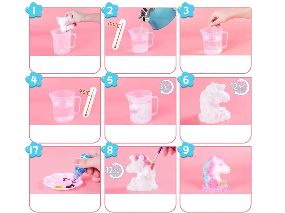 Magiczny zestaw do hodowli kryształów z jednorożcem to propozycja dla każdego małego dziecka lubiącego doświadczenia, eksperymenty. Zestaw jest bardzo łatwy w obsłudze, a efekt na pewno Cię zaskoczy. Gotową figurkę jednorożca należy zanurzyć we wcześniej przygotowanym roztworze, a następnie odczekać odpowiedni czas jak kryształy zaczną rosnąć na jednorożcu. Potem to tylko osuszenie figurki i nadanie jej właściwych kolorów. Coś magicznego przed Wami. Eksperymentowanie i odkrywanie cudów natury połączone z zabawą to wspaniała inspiracja dla każdego dziecka. Wszelkiego rodzaju doświadczenia pomagają rozwijać koncentrację oraz precyzję. Zestaw zawiera:- gipsowa figurka jednorożca- krystaliczny piasek- 500 ml pojemnik na roztwór- podstawka na farby- drewniany patyczek- pędzelek- farby czerwona, żółta, niebieska- instrukcja obrazkowaWykonanie:Należy wsypać całą zawartość woreczka do pojemnika zalać 100 ml wody o temperaturze 100ºC, zachowując wszelką ostrożność, najbezpieczniej pod nadzorem osoby dorosłej, a następnie uzupełnić 450 ml zimnej wody i dokładnie wymieszać przez około 3- 5 minut do całkowitego rozpuszczenia.Koniecznie należy odczekać aż płyn ostygnie. Następnie włóż model gipsowy do roztworu i do 2-3 h obserwuj proces krystalizacji. Po tym czasie model jednorożca wyciąg pozostaw do wyschnięcia przez 12h. Kolejnym krokiem jest etap ozdabiania jednorożca według własnego pomysłu. Wykonana samodzielnie praca może stać się piękną ozdobą pokoju, prezentem dla najbliższej osoby.UWAGA!Eksperyment przeprowadzaj tylko pod nadzorem osoby dorosłej.Zestaw przeznaczony dla dzieci powyżej 8-go roku życia.Zestaw świetnie sprawdzi się jako mini laboratorium, obserwatorium, lub jako zadanie domowe, itp. Pozwoli poznać Twojemu Dziecku magiczny świat, co może zaowocować w jego przyszłości. Zestaw jest świetnie dopracowany z zadbaniem o najdrobniejsze szczegóły.Sklep Jokomisiada posiada szereg zestawów naukowych i do samodzielnego tworzenia, które pomagają rozwijać kreatywność u dzieci.