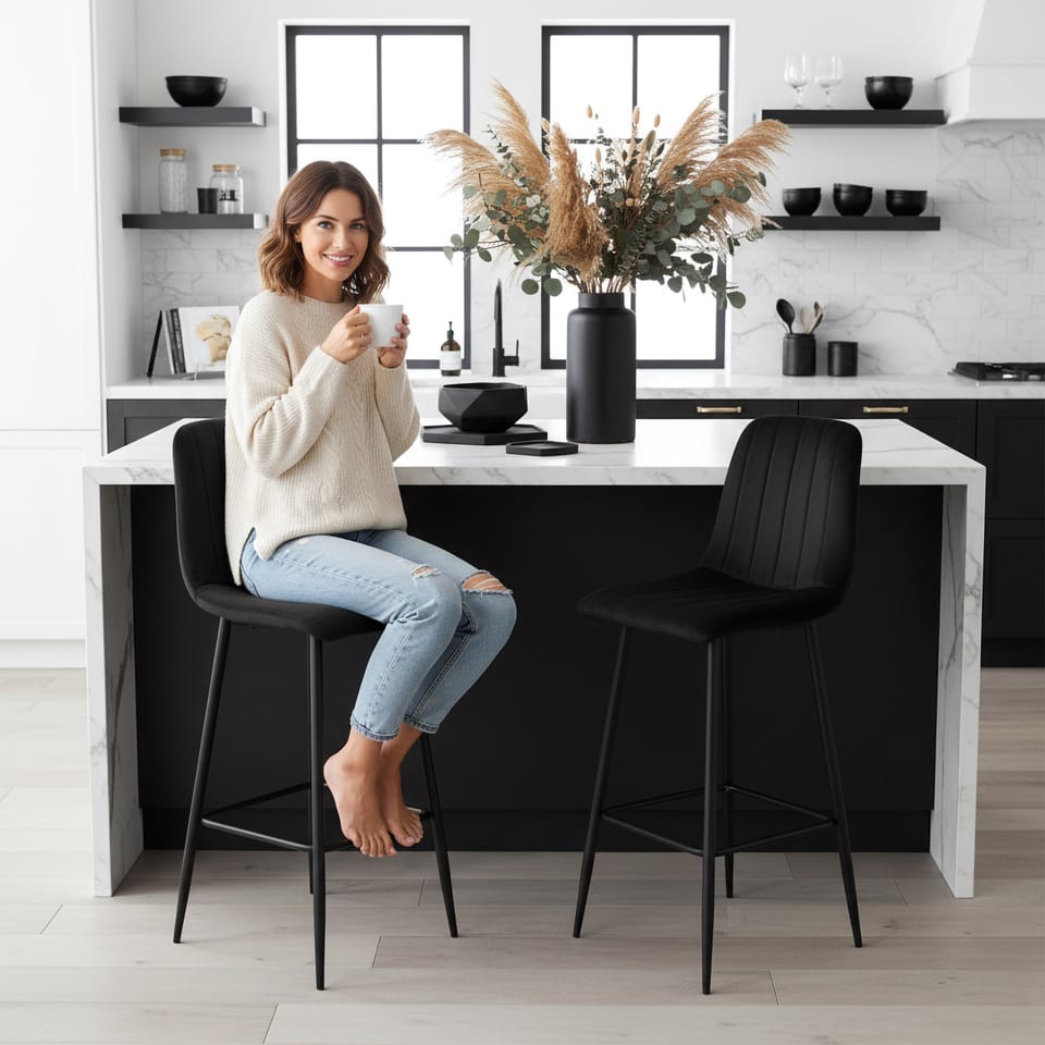 Hoker barowy Toronto czarny VelvetPrzeznaczenie: kuchnia, punkt informacyjny, salon kosmetyczny | Kolory: czarny⭐ Tapicerowane, welurowe obicie⭐ Ciekawe przeszycia⭐ Ochronne podkładki pod nogami⭐ Dopuszczalna waga 120 kg⭐️ Zakup bezpośrednio od producenta Bardzo elegancki, wygodny i stabilny hoker, wykonany z materiałów najwyższej jakości. Stabilna podstawa w kolorze czarnego matu i unikatowy wzór siedziska tworzą doskonałe połączenie.Hoker doskonale dopełni wnętrza w stylu loftowym, nowoczesnym i glamour. Cechy produktu✅Materiał siedziska: welur✅Materiał stelaża: stal malowana proszkowo✅Wykończenie stelaża: czarny mat✅Waga: 5,40 kg✅Maksymalne obciążenie 120 kg✅Ergonomiczna podpórka pod nogi✅Komfortowe oparcie✅Ochronne podkładki pod nogami✅Pikowane siedzisko✅Nowoczesny design✅Styl: loftowy, industrialnyWymiary produktuWysokość całkowita 110 cmGłębokość całkowita 50 cmSzerokość całkowita 43 cmWysokość oparcia 37 cmSzerokość oparcia 37 - 42 cmSzerokość siedziska 42 cmGłębokość siedziska 38 cmWysokość do siedziska 77 cmWysokość podnóżka 28 cmRozstaw nóg 43 x 43 cm Informacje dodatkowePrzedstawione kolory należy traktować poglądowo - mogą odbiegać od rzeczywistych ze względu na różne ustawienia monitorów oraz proces obróbki zdjęć. Rzeczywiste wymiary mogą się różnić od podanych wyżej. Tolerancja błędów może wynosić +/- 5%. Marka:eHokeryKod produktu:324301MGKod EAN:5902340324301Kolor:czarnyWysokość całkowita: 110 cmWysokość do siedziska:77 cmSzerokość siedziska:42 cmSzerokość całkowita:43 cm