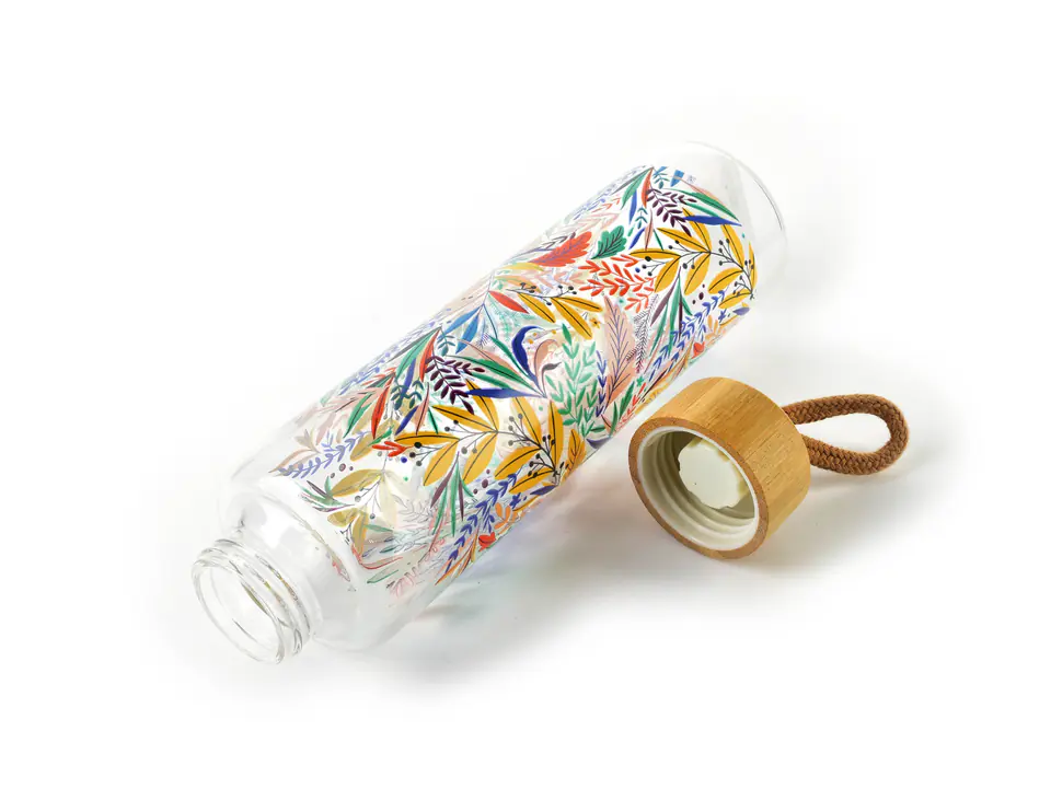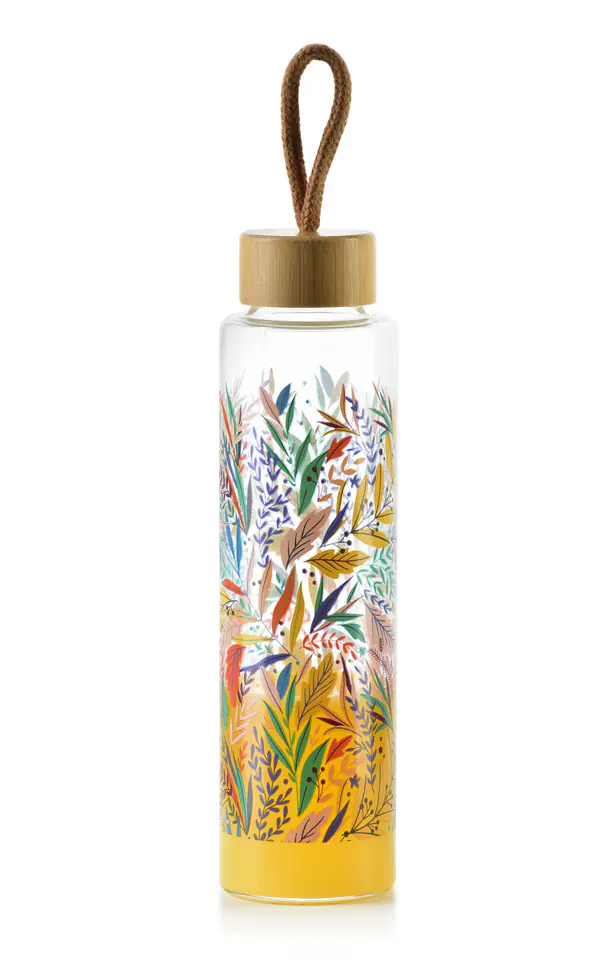 HOLLIE LEAVES Butelka szklana z wiosennym wzorem w kolorowe liście. Wykonana z najwyższej jakości szkła boro-krzemowego. Zakrętka jest wykonana z bambusu. -HOLLIE LEAVES jest lekka, -do gorących i zimnych napojów -idelana na wycieczki i na codzień -nie nadaje się do zmywarki i kuchenki mikrofalowej -nakretka posiada sznurek który ułatwia jej noszenie -jest dobrym pomysłem na prezent! pojemność: 600ml wymiary: 6,4x4,4xh24cm zapakowana jednostkowo w brązowy box waga: 280g