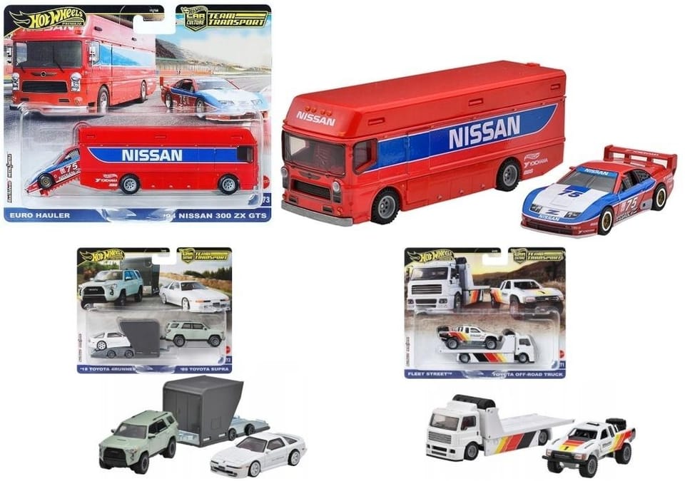 Euro Hauler + 94 Nissan 300ZX GTS (HRV44-4B10)zestaw inspirowany japońską serią wyścigową IMSA. Euro Hauler to masywna ciężarówka z podjazdem, obradowana logotypami Nissana, Yokohamy i BBS. 300ZX GTS to nisko osadzony bolid z wyraźnym tylnym skrzydłem i grafiką zespołu wyścigowego.