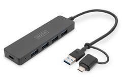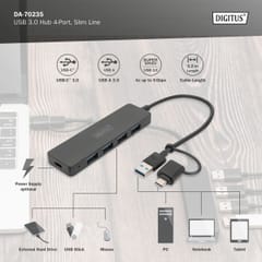 Rozwiązanie rozszerza możliwości notebooka wyposażonego w port USB-C lub USB-A o 4 dodatkowe porty USB Super-Speed. Koncentrator USB 3.0 firmy DIGITUS Slim Line to idealne rozwiązanie do rozszerzenia możliwości w każdym miejscu pracy. Można podłączyć maksymalnie cztery urządzenia USB i jednocześnie ich używać. Umożliwia to wygodne korzystanie z wielu urządzeń do sterowania / wprowadzania danych lub przenośnych dysków. Dzięki technologii USB 3.0 przepustowość transmisji może osiągnąć prędkość do 5 Gbps, gwarantując szybką wymianę danych. Dzięki smukłej konstrukcji ten 4-portowy koncentrator jest idealnym towarzyszem w podróży, ale również niezbędny w domu i biurze.