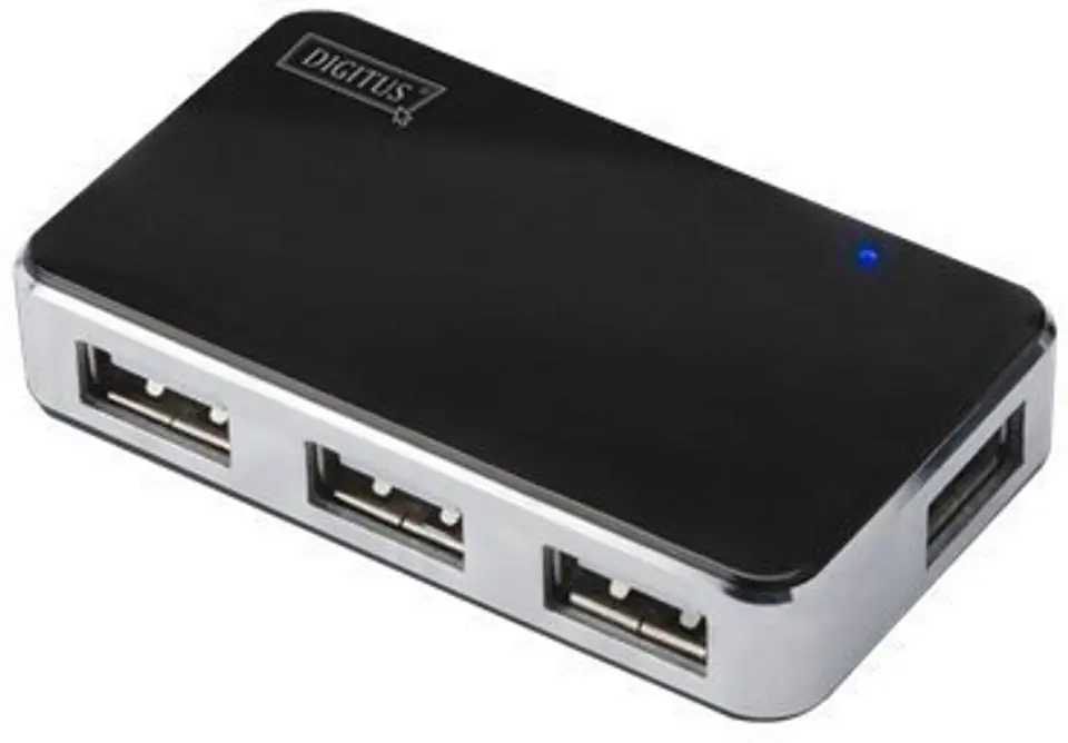 Hub DIGITUS USB 2.0 o 4 portach umożliwia jednoczesne podłączenie do 4-rech urządzeń USB do PC lub Mac. Wetknij ulubione urządzenie USB i skorzystaj z bardzo szybkiego połączenia. Ma przejrzystą i elegancką konstrukcję z fortepianową czernią wykończenia od góry i spodu oraz aluminiowe krawędzie.