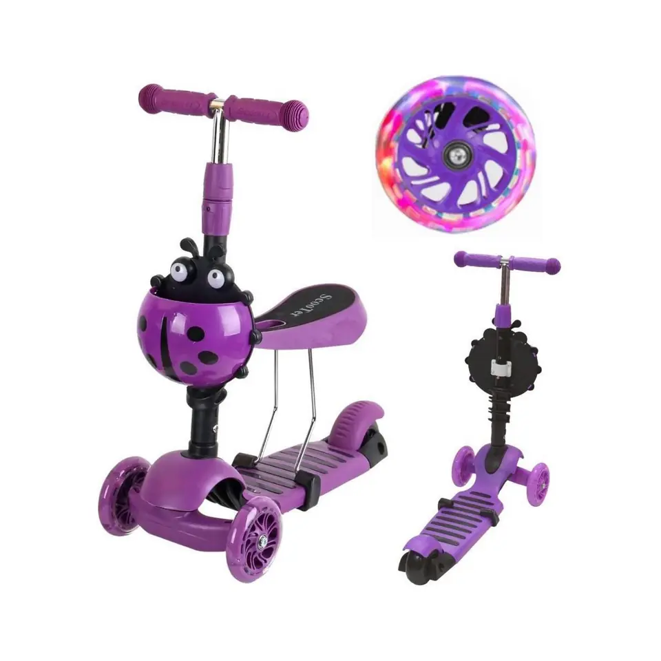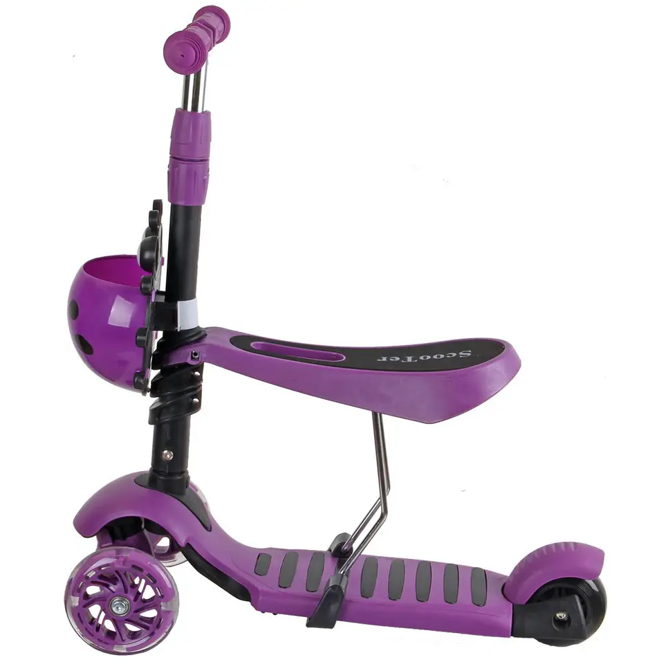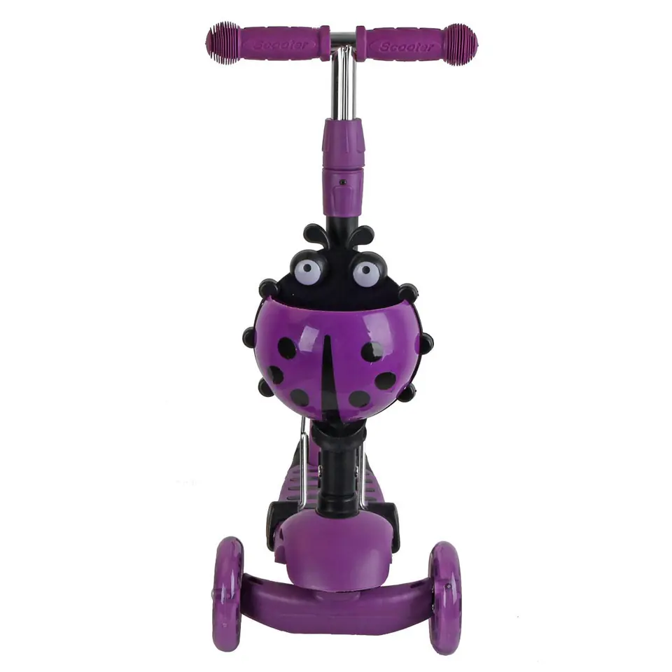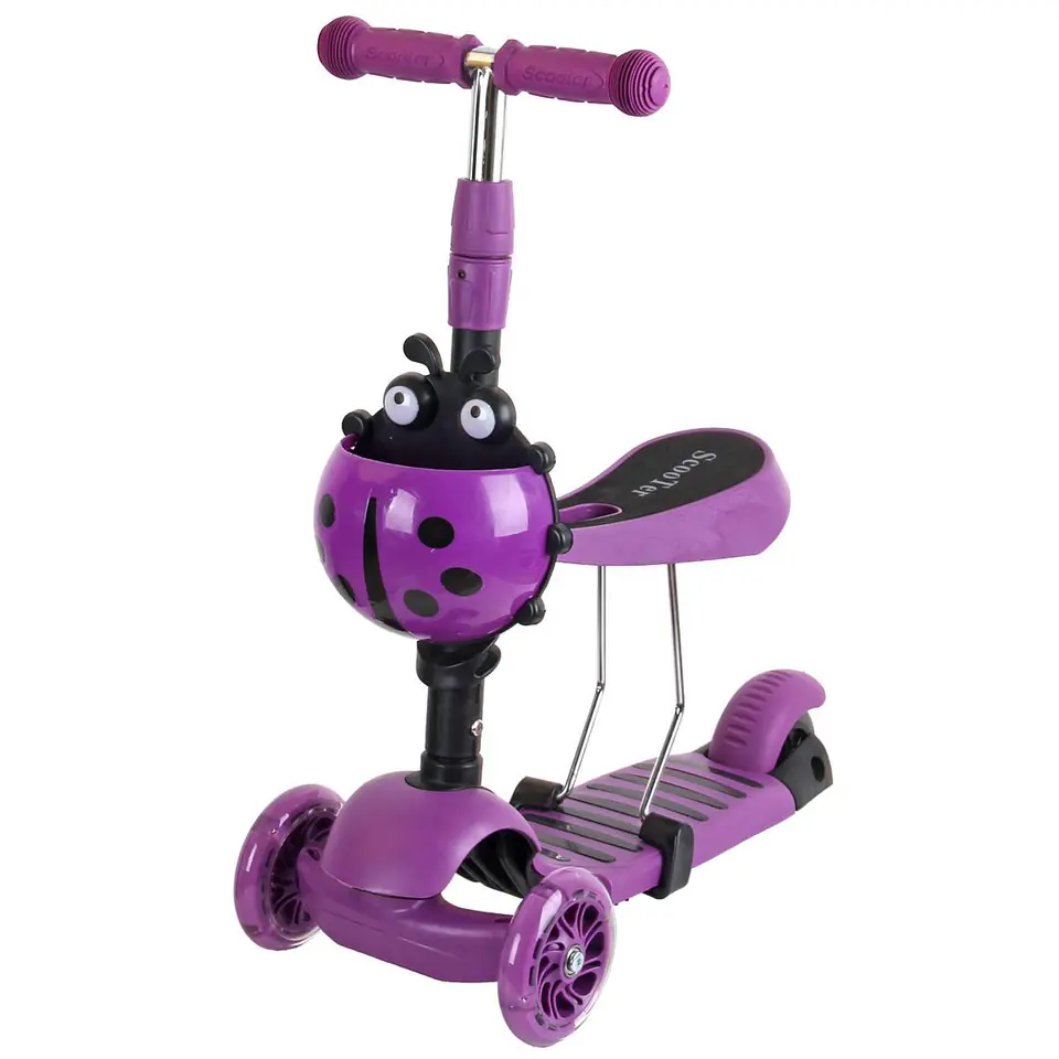 - podwójne kółka z przodu zapewniają stabilność i bezpieczeństwowzmocniony, antypoślizgowy podest z poliamidu oferuje obciążenie nawet do 50 kgwyprofilowane zdejmowane siedzisko pozwoli szybko zmienić jeździk w hulajnogętylne koło wyposażone w hamulec umożliwi bezpieczne zatrzymanie hulajnogi w dowolnej chwiliuchwyty wyposażone w absorbery pochłaniające energię uderzenia kierownicy o podłoże, podnoszą komfort użytkowaniazamontowany koszyczek w kształcie biedronki będzie idealny do ukrycia skarbówkolorowe LED w przednich kółkach pozwolą się wyróżnić i zwiększyć bezpieczeństwo 3 - stopniowa regulacja kierownicy i siedzenia sprawi, że hulajnoga będzie rosnąć wraz z dzieckiem!