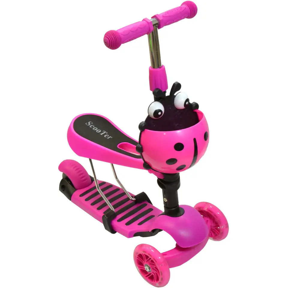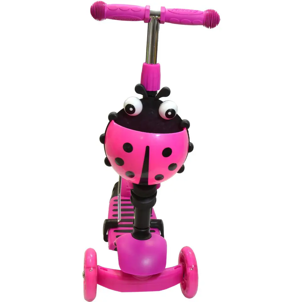 - podwójne kółka z przodu zapewniają stabilność i bezpieczeństwowzmocniony, antypoślizgowy podest z poliamidu oferuje obciążenie nawet do 50 kgwyprofilowane zdejmowane siedzisko pozwoli szybko zmienić jeździk w hulajnogętylne koło wyposażone w hamulec umożliwi bezpieczne zatrzymanie hulajnogi w dowolnej chwiliuchwyty wyposażone w absorbery pochłaniające energię uderzenia kierownicy o podłoże, podnoszą komfort użytkowaniazamontowany koszyczek w kształcie biedronki będzie idealny do ukrycia skarbówkolorowe LED w przednich kółkach pozwolą się wyróżnić i zwiększyć bezpieczeństwo 3 - stopniowa regulacja kierownicy i siedzenia sprawi, że hulajnoga będzie rosnąć wraz z dzieckiem!