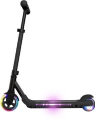 Hulajnoga elektryczna dla dzieci, lekka a jenocześnie wytrzymała, rególowana kierownica, kolorowe oświetlenie LED powierzchni do stania i kół. Gumowe opony z przodu wąska 5" i szeroka 3,5" z tyłu dla utrzymania lepszej równowagi. Hamulec nożny na tylnym kole jak w klasycznych hulajnogach.