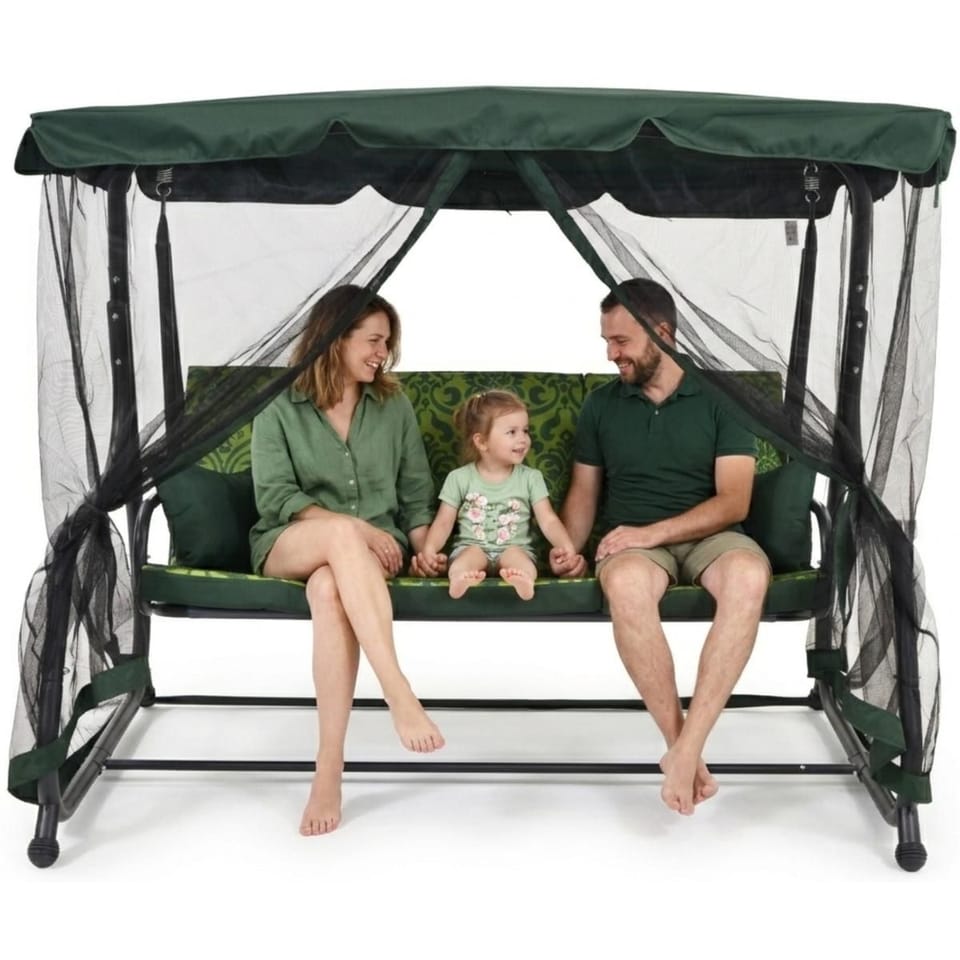 - funkcja 2w1- huśtawka i wygodne łóżko w jednymsolidny stalowy stelaż zapewnia stabilność i bezpieczeństwoszerokość 200 cm zapewnia przestrzeń do siedzenia 3 osobomdaszek wykonany z 180g poliestru, skutecznie chroni przed słońcem i lekkim deszczemwygodne siedzisko i oparcie z wypełnieniem z waty poliestrowej gwarantują wygodę na najwyższym poziomieuniwersalna kolorystyka pasuje do każdej przestrzeni ogrodowej, tarasu czy balkonumoskitiera zadba o ochronę przed owadami