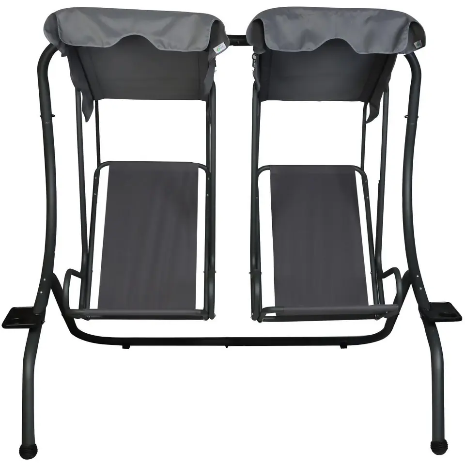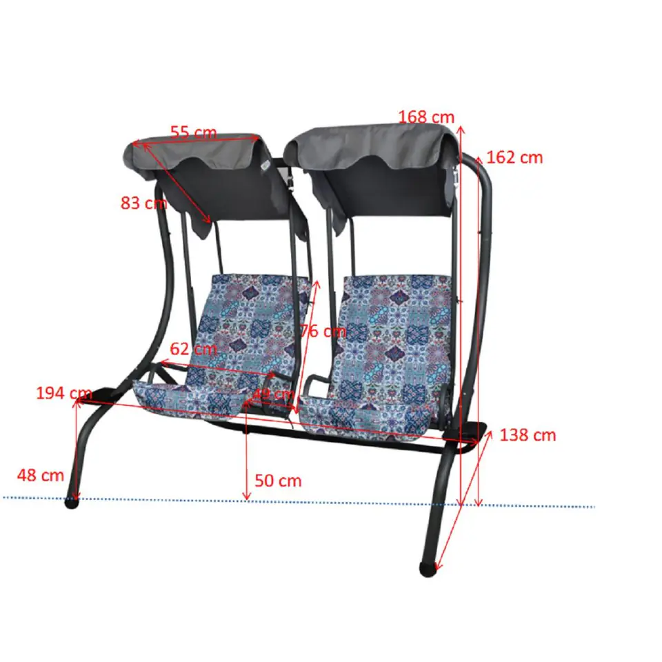 Nie tylko dzieci lubią się huśtać. Połącz przyjemność bujania z wypoczynkiem w ogrodzie! Huśtawka SONIC z 2 wygodnymi fotelami stworzą dla Ciebie przytulny kącik wypoczynkowy na działce lub tarasie.Piękno w każdym ogrodzieZamień pustą przestrzeń w estetyczne i przyjemne miejsce do siedzenia. Huśtawka SONIC jest świetnym dodatkiem w ogrodzie, na działce lub tarasie. Uniwersalna gama kolorystyczna doda uroku wielu aranżacjom.Wygoda i stabilnośćHuśtawka ogrodowa to idealne miejsce relaksu wiosną, latem i jesienią. Wypoczynek stanie się przyjemniejszy niż dotąd. Szerokie daszki uchronią Cię przed nadmiernym słońcem lub deszczem i dadzą cień w upały. Daszki możesz także łatwo zdjąć, ciesząc się promieniami słonecznymi. Fotele opierają się na wzmocnionych sprężynach. Miękkie materiały w siedziskach troszczą się o komfort i wygodę podczas bujania. Obustronne podstawki (na szklankę, butelkę, tablet, telefon itp.) czynią użytkowanie wygodniejszym.Stabilna konstrukcja (profile stalowe) utrzymają 2 dorosłe osoby. Produkt wykonany jest ze stali, wyróżnia go wytrzymałość na duże obciążenia, łatwość montażu i czyszczenia.Parametry:• Wymiary- całkowite ze stelażem ok.: długość 194 cm / głębokość 138 cm / wysokość z daszkiem 168 cm - siedzisko: szerokość 62 cm / głębokość 45 cm- oparcie: szerokość 62 cm / wysokość 76 cm- daszek: szerokość 55 cm / długość materiału 83 cm• Materiały- stal (rama)- poliester waterproof 180g/m2 (daszek i siedzenie), poliester 300x600D oxford PVC (poduszki), rama stal • Średnice rur: 48 mm, 28 mm, 25 mm, 16 mm• Maksymalne obciążenie: 120 kg x 2 (łącznie 240 kg)• Fotele z niezależnym zawieszeniem