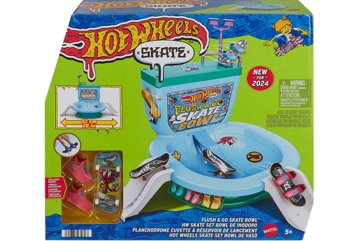 Naciśnij dźwignię na muszli Hot Wheels Skate, aby wypuścić deskorolkę Hot Wheels Skate do jazdy palcami i zacząć szaleć po tym zwariowanym zestawie z motywem toalety! Są tu fantastyczne powierzchnie do jazdy, w tym ogromna muszla, rampy inspirowane papierem toaletowym, tylna rampa i poręcz, a do tego miejsce do przechowywania 4 deskorolek do jazdy palcami i 6 par butów. W zestawie jest jedna wyjątkowa deskorolka do jazdy palcami i 1 zdejmowana para butów deskorolkowych na palce. (Dodatkowe deskorolki i buty sprzedawane oddzielnie). Kolory i elementy dekoracyjne mogą się różnić.