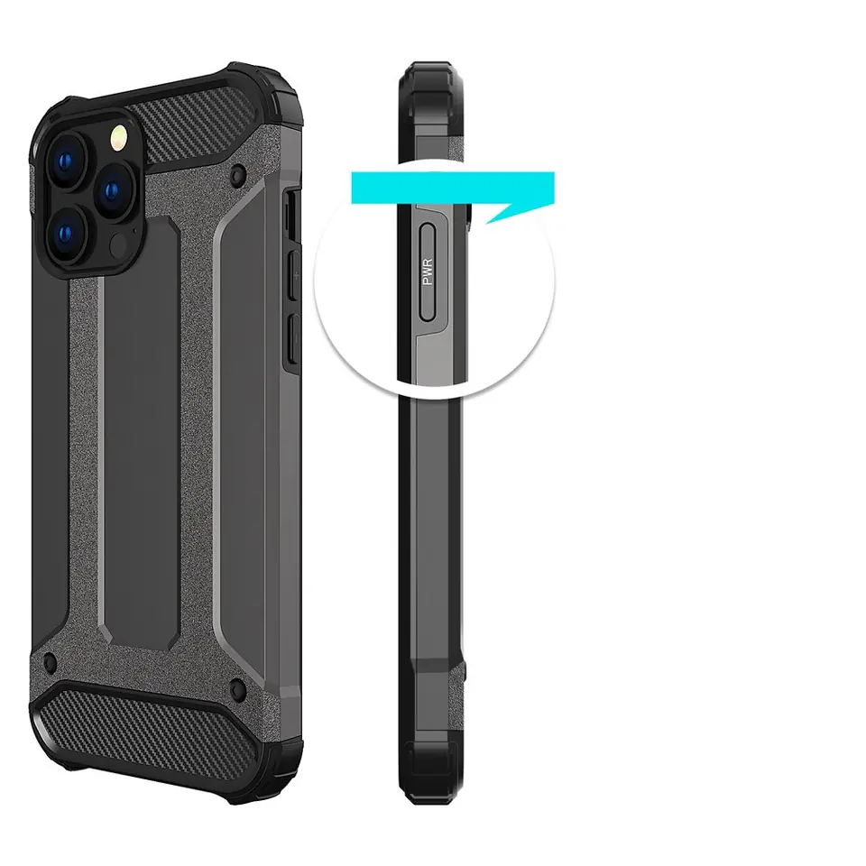 Etui z serii Hybrid Armor jest wykonane z termoplastycznego i wytrzymałego tworzywa, które swoim wyglądem imituje piaskowany metal i karbon. Pokrowiec jest dopasowany do iPhone 14 Pro Max, doskonale chroni telefon przed zniszczeniami wskutek upadków lub zarysowań (na przykład przez noszone w kieszeni klucze). Podniesione krawędzie dookoła ekranu i tylnego aparatu zabezpieczają telefon od zarysowania tych elementów kiedy ten leży na płaskiej powierzchni. Posiada responsywne przyciski i wycięcia na porty. Idealny dla osób, które cenią sobie styl, jakość i chcą zadbać o swoje urządzenie.