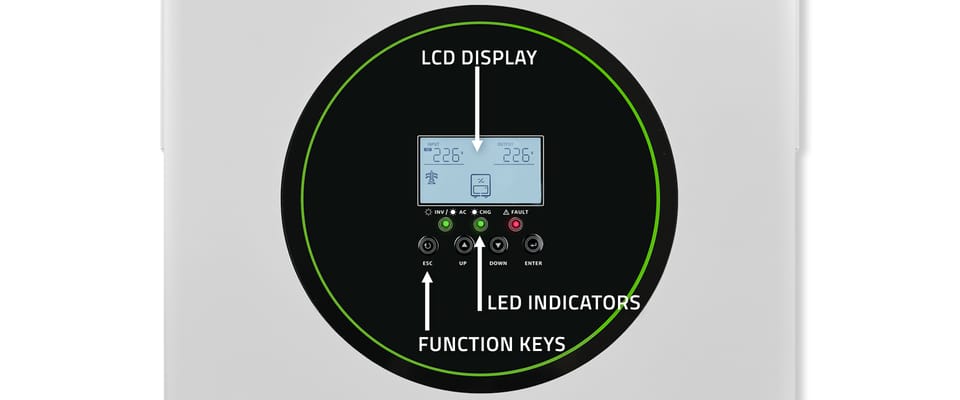 - możliwość zmiany ustawień priorytetu ładowarki AC/Solar za pomocą wyświetlacza LCD,
