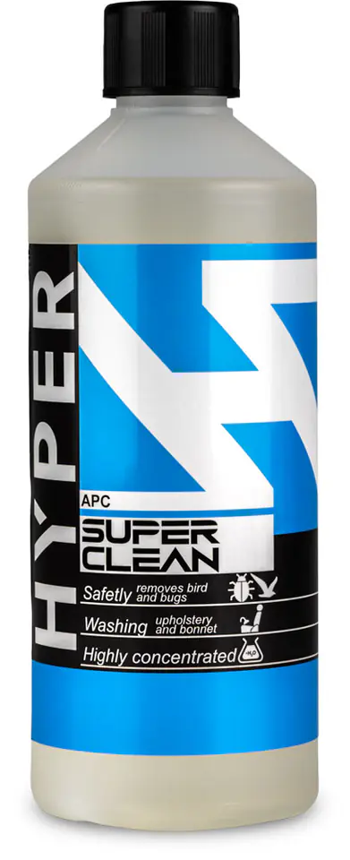 Hyper Super Clean APC – produkt typu APC. Wszechstronność produktu jest zależna tylko od rozcieńczenia. Może być stosowany do powierzchni zewnątrz i wewnątrz pojazdu. Silnie odtłuszcza powierzchnie czyszczące. Zawiera znikome ślady sodu i potasu. Dzięki Super Clean wykonasz skuteczny pre wash, wyczyścisz opony, felgi, wypierzesz tapicerkę materiałową, wykonasz bonnet, wyczyścisz plastiki, usuniesz insekty i ptasie odchody z karoserii.