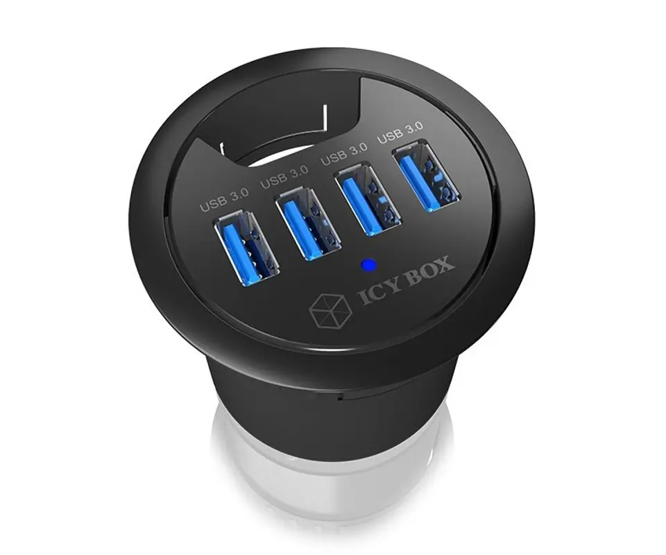 IB-HUB1403 montowany jest w otworze w Twoim biurku. Może być instalowany w otworach o średnicy 60 mm, bez użycia narzędzi. Dodatkowo oferuje wystarczającą ilość miejsca, aby przeprowadzić kable.