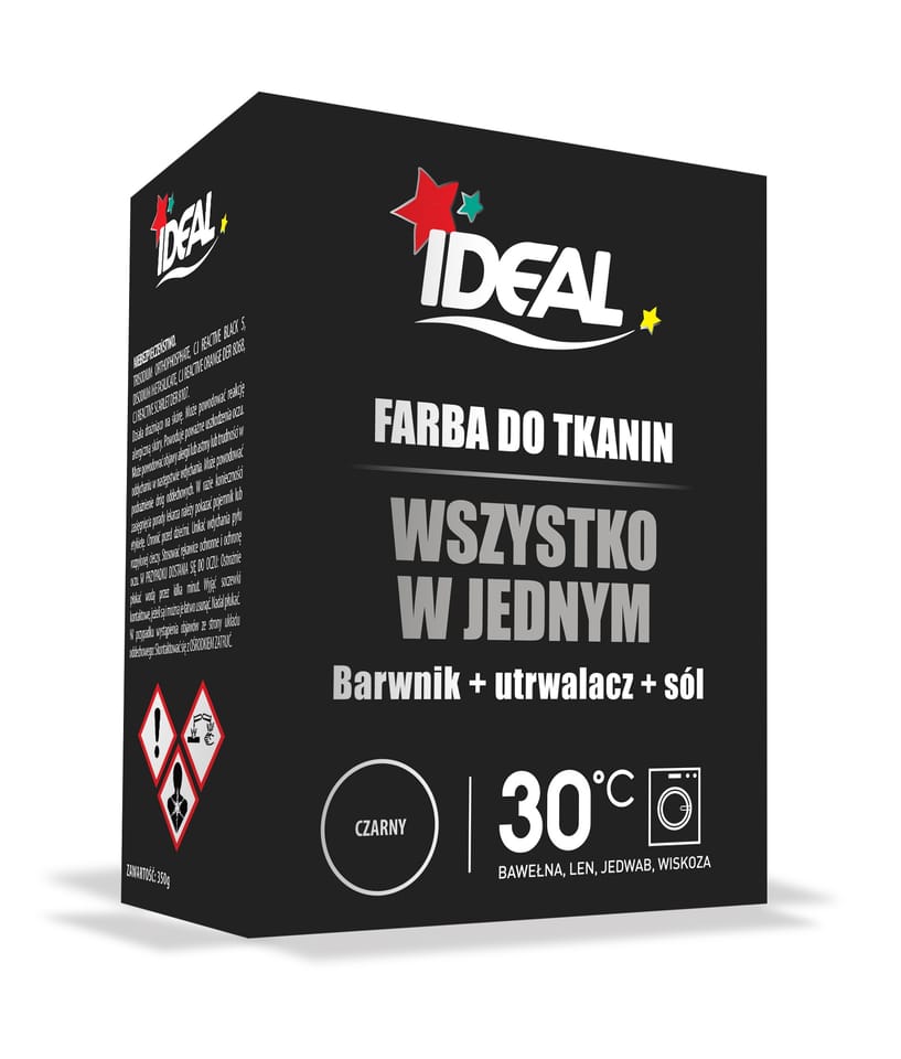 IDEAL All in One barwnik do tkanin Czarny 350g (P1)3045206158138Gama gotowych do użycia barwników w proszku do wszystkich rodzajów tkanin. Dzięki saszetce ALL IN ONE (barwnik + utrwalacz + sól) wystarczy jedna czynność, aby uzyskać gwarantowany, jednolity kolor w temperaturze już od 30C.Sposób użycia:1) Odetnij wierzchołek saszetki i ustaw ją w bębnie, nie opróżniając zawartości. 2) Połóż suchą tkaninę obok saszetki, nie przewracając jej. 3) Włącz normalny cykl dla bawełny w temp. 30C * (min. 1 godz.) lub 40C, aby uzyskać bardziej intensywne zabarwienie.Po zakończeniu cyklu wyjmij saszetkę i ponownie uruchom ten sam cykl, dodając porcję detergentu. Przeczytaj szczegółowy sposób użycia opisany wewnątrz pudełka. Bez zagrożenia dla pralki i kolejnych partii prania. *Bez prania wstępnego. Nie stosować cyklu szybkiego, do tkanin delikatnych lub syntetycznych.