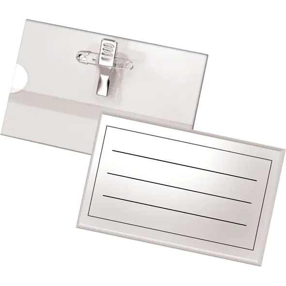 Identyfikator wykonany z przezroczystego, sztywnego tworzywa. Wyposażony w mocowanie za pomocą klipsa z agrafką.