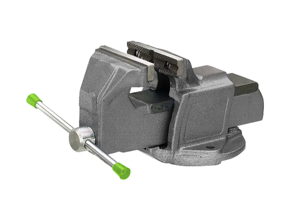 Z żeliwa. Hartowane klocki szczęk i kowadełko. Śruba całkowicie zakryta, z gwintem trapezowym.