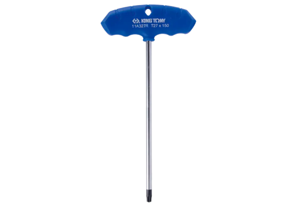 Imbus TORX z uchwytem “T” marki King Tony. Wykonany ze stali stopowej SNCM-V (stop nikiel-chrom-molibden) zapewniającej wysoką wytrzymałość i żywotność narzędzia. Powierzchnia chromowana z czarną końcówką. Grot Torx T30. Długość całkowita 238 mm.