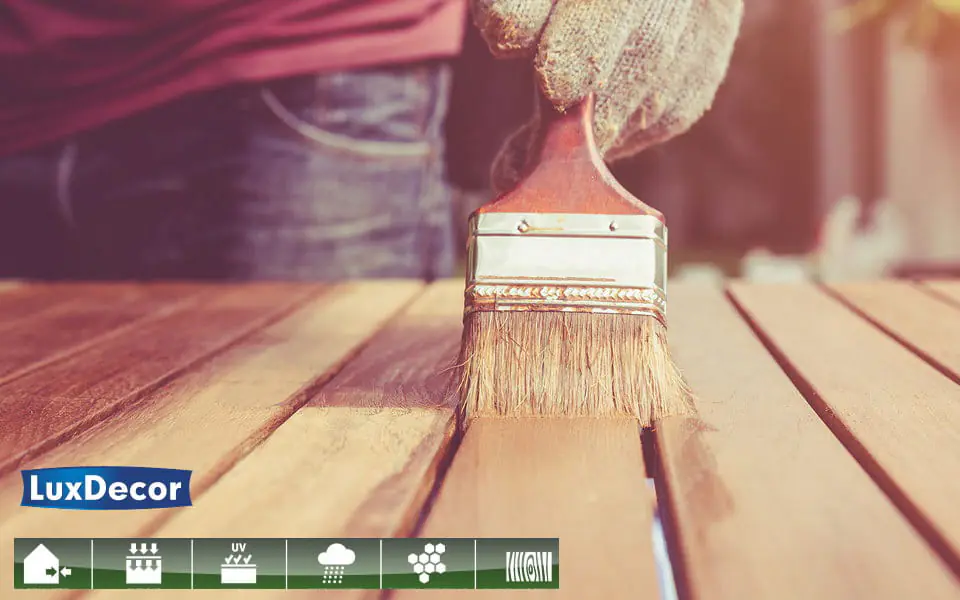 MALOWANIE/STOSOWANIE: LuxDecor stosuje się w postaci nie rozcieńczonej. Produkt posiada konsystencję od płynnej do galaretowatej. Przed użyciem produkt należy dokładnie wymieszać w celu uzyskania jednorodnej konsystencji oraz barwy w całej objętości opakowania. Malowanie należy przeprowadzać w temperaturze powyżej 7°C. Wilgotność drewna powinna wynosić poniżej 15%. Nanosić równomiernie za pomocą płaskiego pędzla lub wałka. Przed impregnowaniem właściwej powierzchni producent zaleca wykonanie testu w miejscu nie widocznym w celu zapoznania się z techniką malowania. Finalny kolor zależy od wielu czynników, między innymi od jakości i gatunku drewna, rodzaju obróbki jego powierzchni, ilości naniesionych warstw. Kolor produktu w opakowaniu może różnić się od podanego na wzorniku. Właściwy jest obserwowany po wyschnięciu impregnowanej powierzchni.