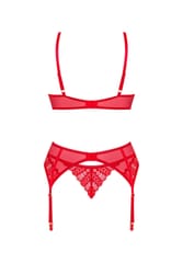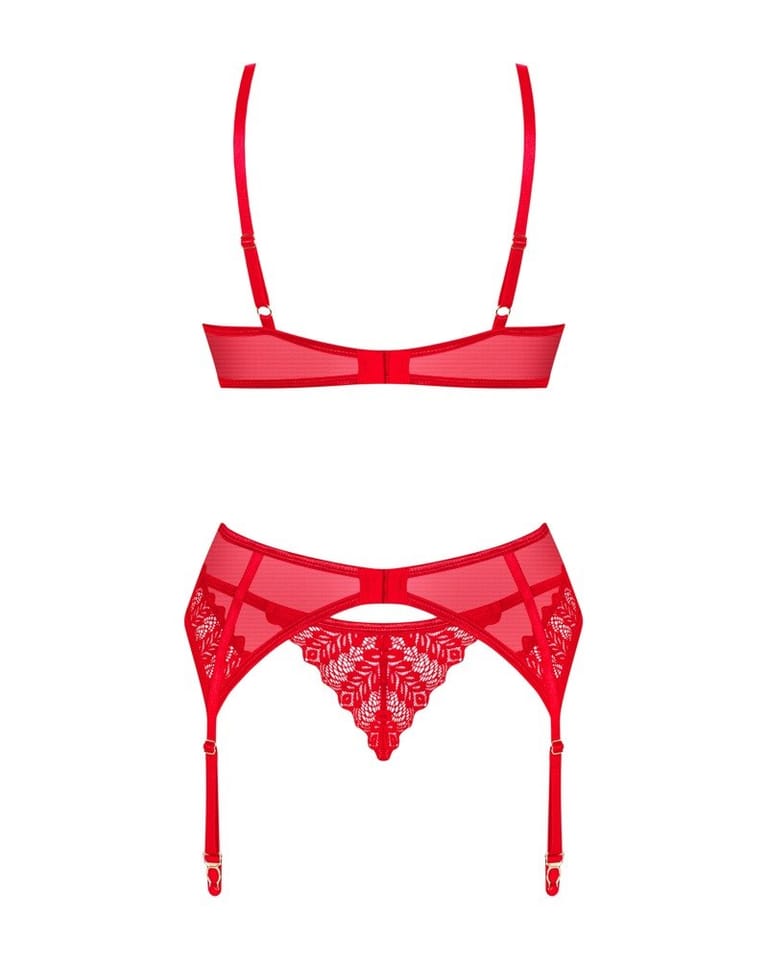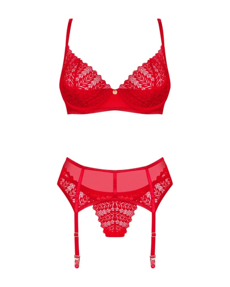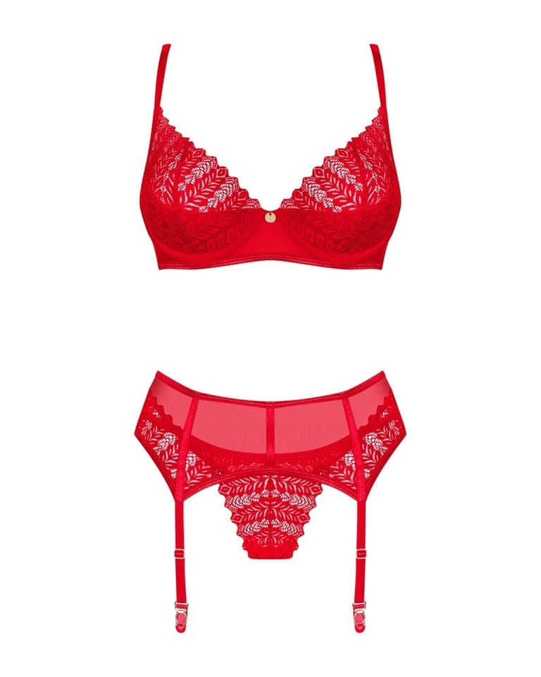 Wywołasz nieskrępowaną ekscytację na twarzy swojej drugiej połówki, gdy tylko pojawisz się w tym gorącym komplecie! Zakochaj się w niebanalnym designie z intrygującymi detalami. Czerwień biustonosza, stringów oraz pasa do pończoch nie pozwoli oderwać od Ciebie wzroku i sprawi, że poczujesz się wyjątkowo pięknie.Poznaj więcej szczegółów:- biustonosz, pas do pończoch oraz stringi w czerwonym kolorze- o doskonałe dopasowanie zadbają regulowane ramiączka i kilkustopniowe zapięcie- subtelne podkreślenie biustu zapewnią miseczki z usztywnieniem i fiszbiny- błyszcząca zawieszka – ciekawy detal- delikatna koronka – łapie spojrzenie- niezwykle wygodny i przyjemny w dotyku materiał (bra and garter belt: 94% polyamide, 6% elastane; thong: 90% polyamide, 10% elastane)