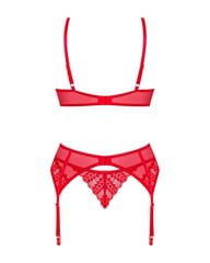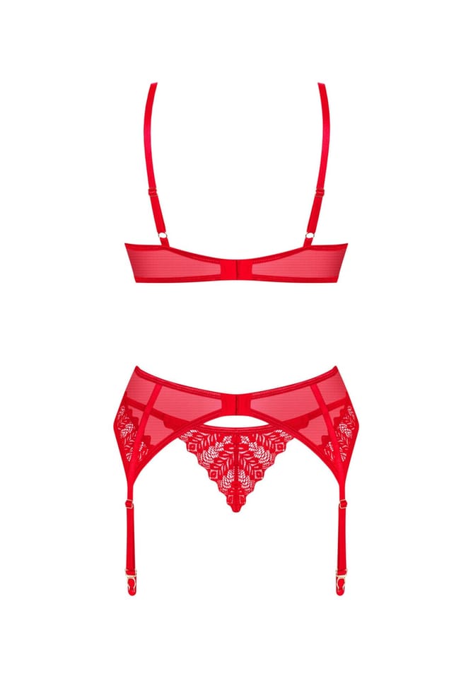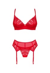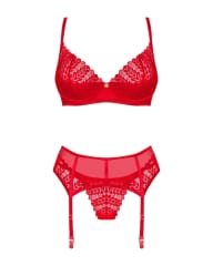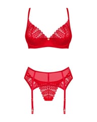 Wywołasz nieskrępowaną ekscytację na twarzy swojej drugiej połówki, gdy tylko pojawisz się w tym gorącym komplecie! Zakochaj się w niebanalnym designie z intrygującymi detalami. Czerwień biustonosza, stringów oraz pasa do pończoch nie pozwoli oderwać od Ciebie wzroku i sprawi, że poczujesz się wyjątkowo pięknie.Poznaj więcej szczegółów:- biustonosz, pas do pończoch oraz stringi w czerwonym kolorze- o doskonałe dopasowanie zadbają regulowane ramiączka i kilkustopniowe zapięcie- subtelne podkreślenie biustu zapewnią miseczki z usztywnieniem i fiszbiny- błyszcząca zawieszka – ciekawy detal- delikatna koronka – łapie spojrzenie- niezwykle wygodny i przyjemny w dotyku materiał (bra and garter belt: 94% polyamide, 6% elastane; thong: 90% polyamide, 10% elastane)