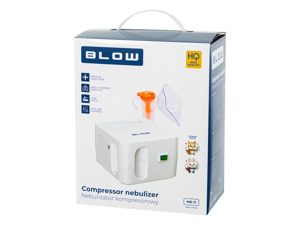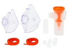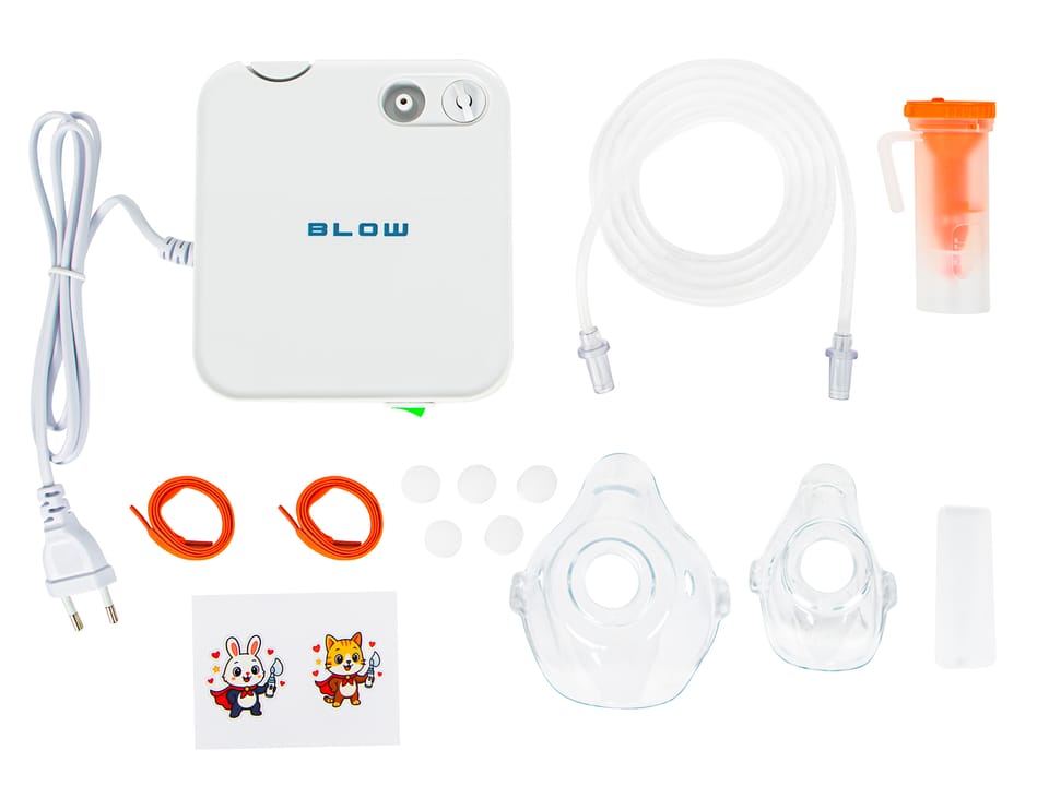 - Zawartość zestawu: Kompresor, zestaw nebulizatora, przewód powietrzny, 5× filtr zapasowy, maska, instrukcja obsługi