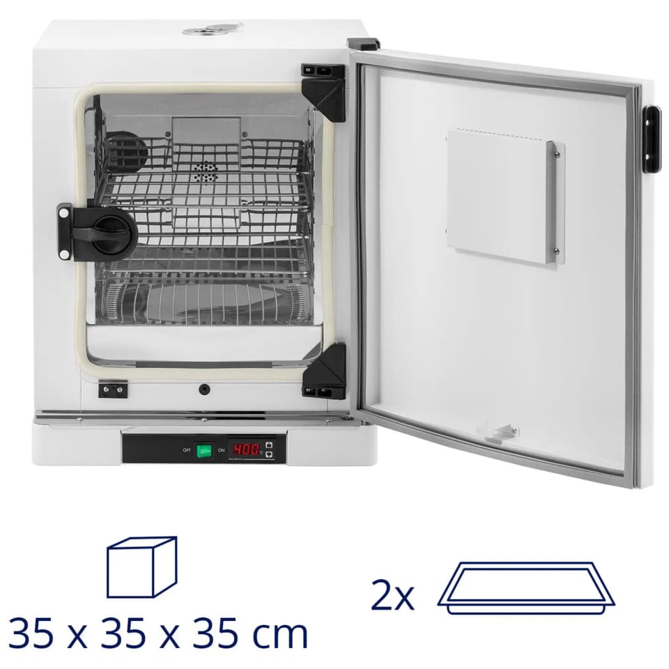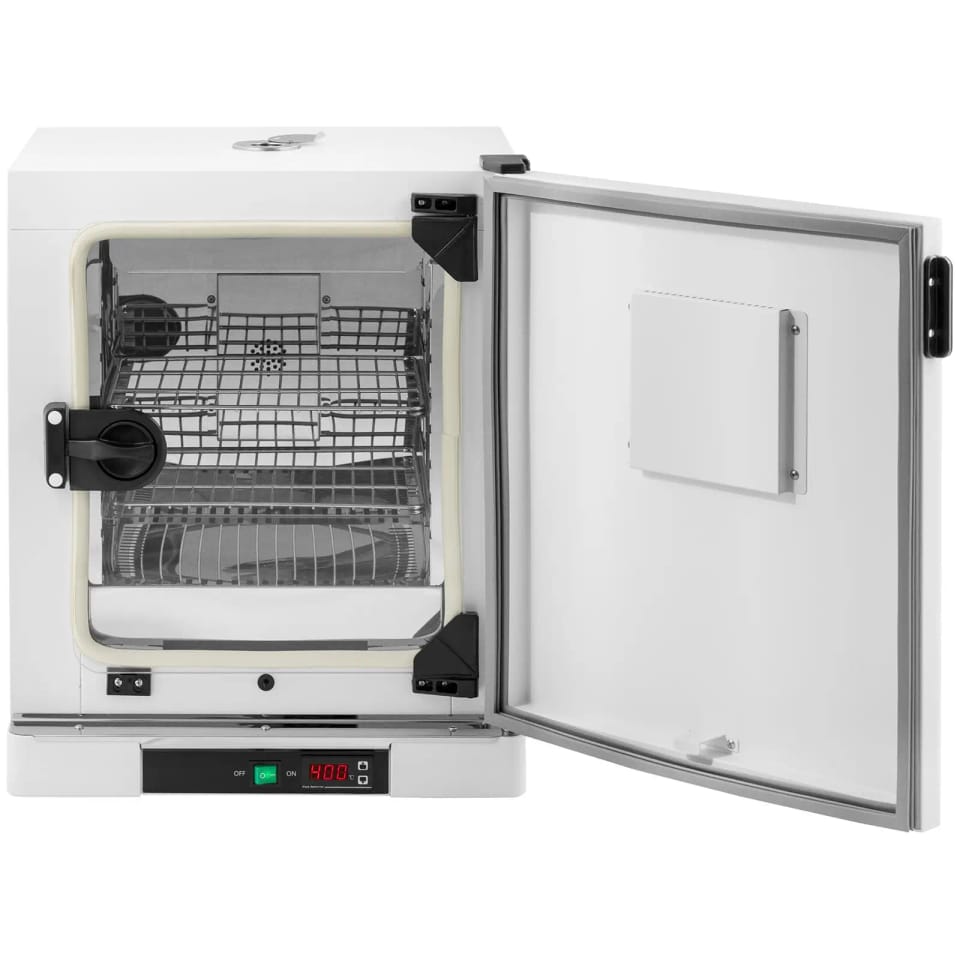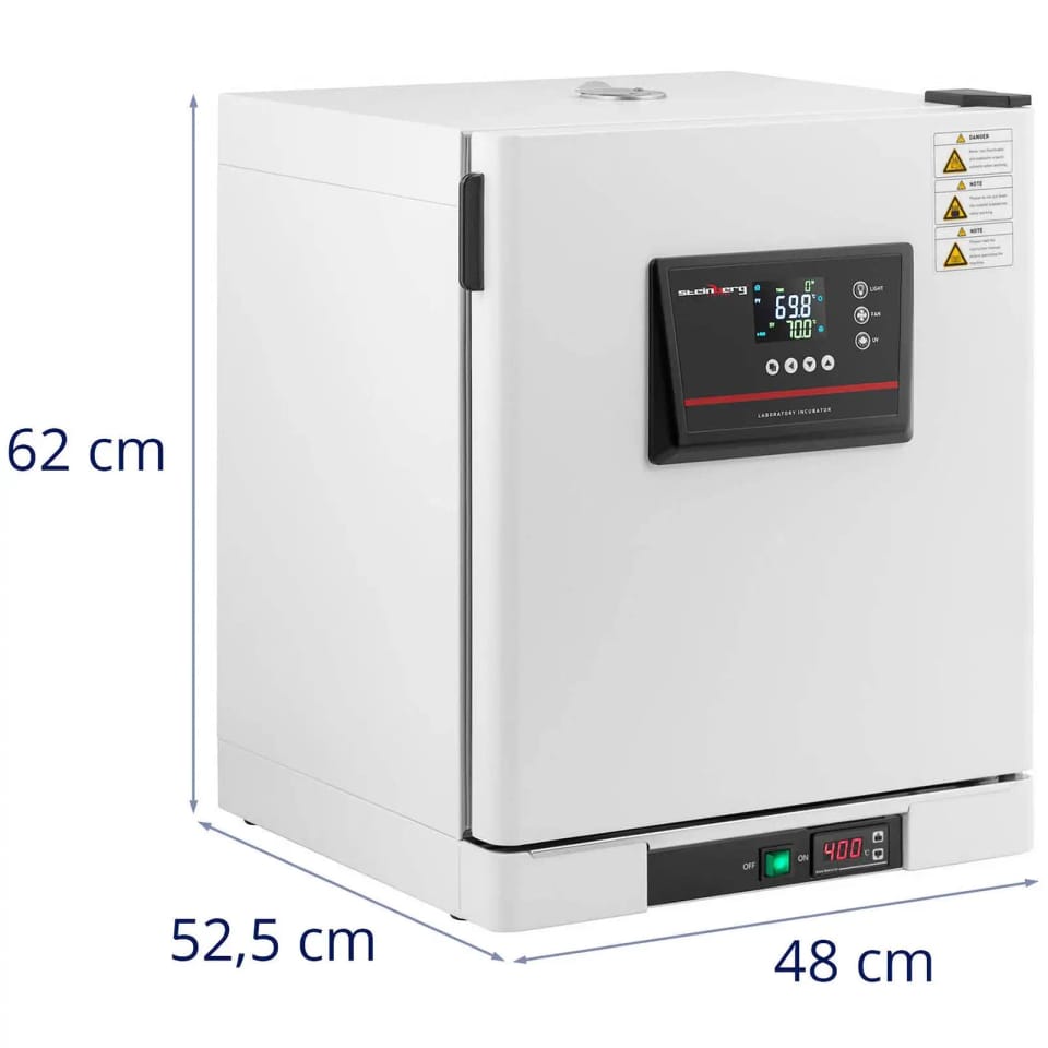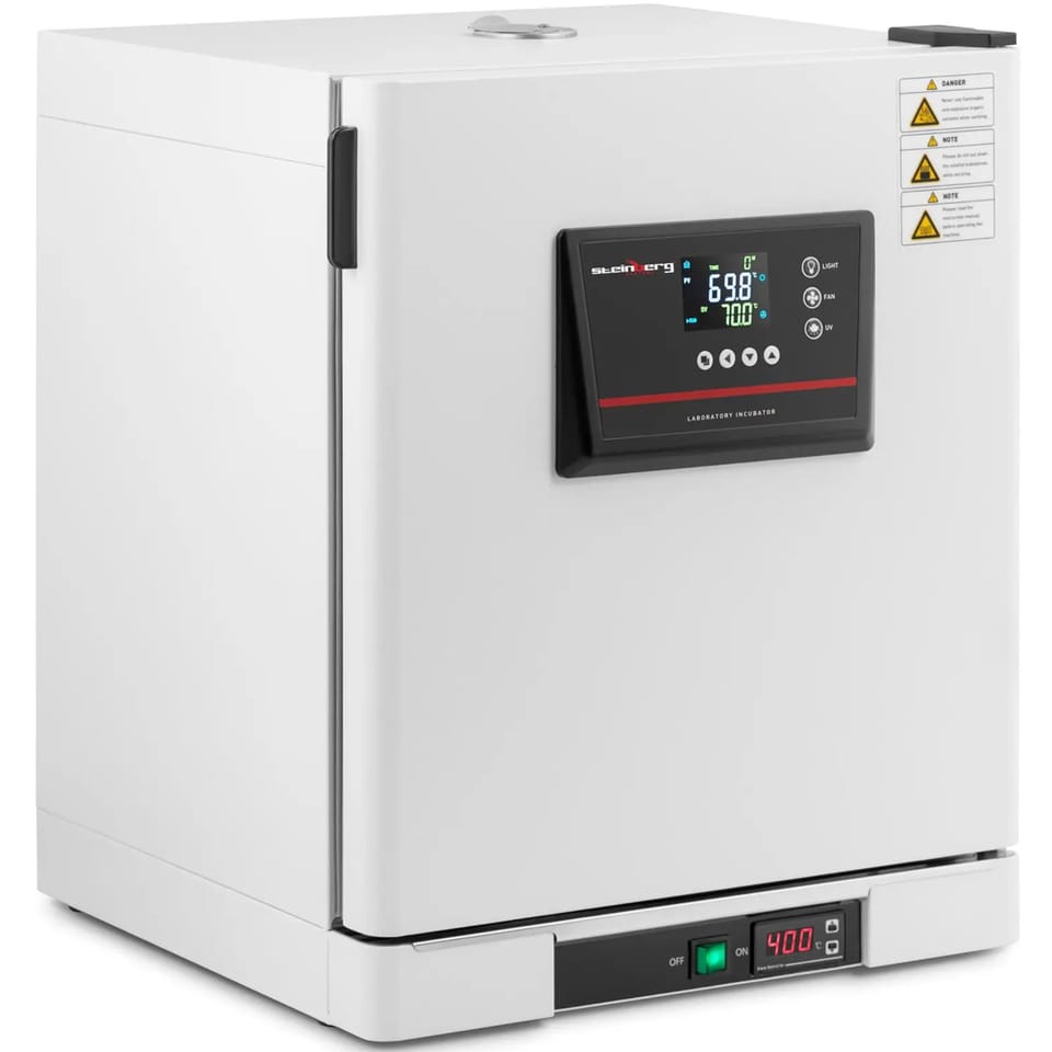 Kod producenta: 10030738Inkubator laboratoryjny marki Steinberg Systems pozwala zapewnić odpowiednią temperaturę do rozwoju mikroorganizmów, kultur komórkowych czy sadzonek. Sprawdzi się w każdym laboratorium w branży farmacji, medycyny, analizy żywności czy innych badaniach. Cieplarka zapewnia idealne warunki za pomocą sterowania PID które można ustawić na dotykowym panelu sterowniczym i sprawdzić na wyświetlaczu LCD. Oferuje takie funkcje, jak ustawienie czasu i temperatury, zabezpieczenie przed przegrzaniem, timer i automatyczne wyłączanie. Regulator temperatury precyzyjnie utrzymuje ustawioną temperaturę w zakresie od 5 do 70deg;C w ustawionym czasie 0-9999 min. Najniższa temperatura nigdy nie spada poniżej temperatury pomieszczenia. Jest to stale sprawdzane przez czujniki i automatycznie korygowane w przypadku odchyleń. W rezultacie utrzymuje temperaturę z dokładnością do ± 1.5deg;C. Interfejs RS-485 umożliwia połączenie z komputerem. Temperaturę można niezależnie ograniczyć na wyświetlaczu cyfrowym. Ponadto urządzenie ma funkcję sterylizacji przy użyciu światła UV. Drzwi do przestronnego wnętrza są hermetycznie uszczelnione uszczelką z gumy silikonowej, co zapewnia minimalną utratę temperatury podczas inkubacji kultur lub bakterii. System dwudrzwiowy oferuje drzwi żaroodporne wykonane ze szkła hartowanego, które w razie potrzeby dają wgląd w postęp hodowli. Drzwi zewnętrzne służą jako pokrywa zamykana na magnesy. Temperatura jest rozprowadzana równomiernie we wnętrzu za pośrednictwem systemu cyrkulacji powietrza (wentylator), dzięki czemu nie występują wahania temperatury. Do oświetlenia komory można wybrać oświetlenie standardowe lub bakteriobójcze. Wnętrze wykonano ze stali nierdzewnej, dzięki czemu jest niezwykle łatwe w pielęgnacji i niewrażliwe na korozję lub inne wpływy otoczenia. Dzięki pojemności 43 l cieplarka laboratoryjna jest kompaktowa i może być również używana w niedużych przestrzeniach. Dzięki poziomom o regulowanej wysokości wnętrze można optymalnie wykorzystać oraz dostosować do różnych próbek lub kultur. Obudowa wykonana jest z wytrzymałej walcowanej stali, która została pokryta powłoką elektrostatyczną. Dzięki temu zewnętrzna warstwa charakteryzuje się niezwykłą trwałością. Oznacza to, że inkubator laboratoryjny wytrzymuje duże obciążenia i łatwo się czyści.Cechy produktu: