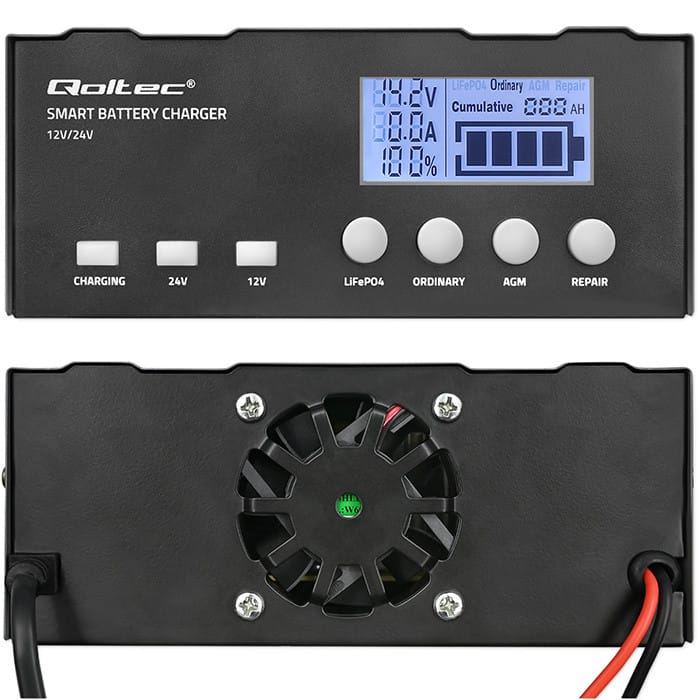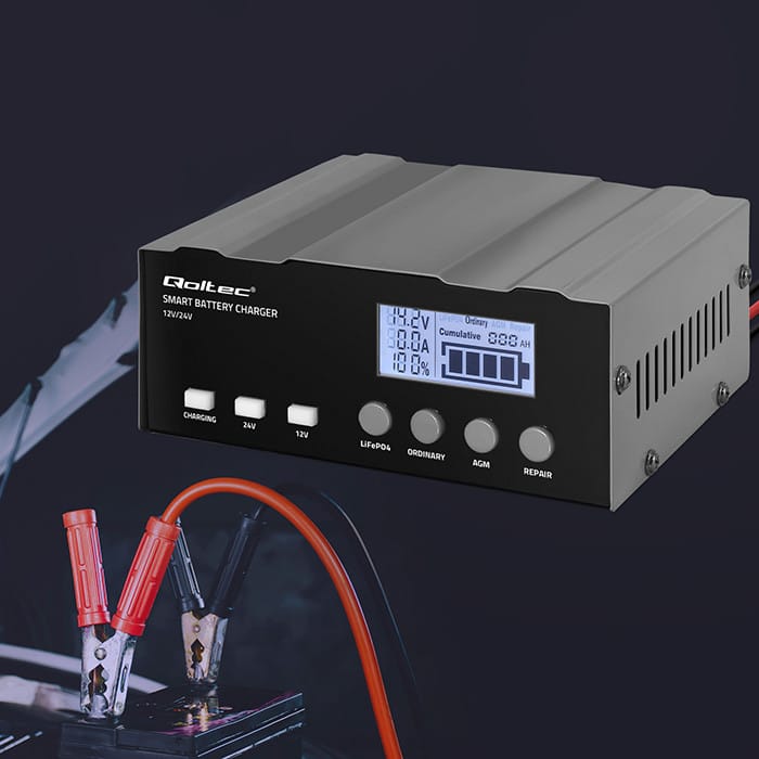 Doskonała wydajność dzięki inteligentnemu sterowaniuWłaściwy dobór odpowiedniej ładowarki do akumulatora jest niezwykle istotny, jeśli chcesz by twój akumulator służył Ci przez przez długi okres. Niewłaściwa ładowarka może skutkować nie tylko wydłużonym czasem ładowania, ale też znacznym skróceniem żywotności akumulatora.Prostownik marki Qoltec to mikroprocesorowa precyzja w ładowaniu - wystarczy jedna ładowarka do różnych typów akumulatorów o pojemności od 4Ah do 105Ah. Idealna do akumulatorów typu: AGM, GEL, WET, SLA, LiFePO4. Czas potrzebny do naładowania zależy od stopnia rozładowania akumulatora i jego rzeczywistej pojemności.Zaufaj naszym ładowarkom - ciesz się nieprzerwaną energiąProstownik sterowany mikroprocesorem zapewnia spersonalizowane ładowanie dla każdego typu akumulatora. Po osiągnięciu pełnego naładowania, urządzenie automatycznie przełącza się w tryb podtrzymywania, utrzymując akumulator w stanie gotowości, co eliminuje ryzyko przeładowania. Dzięki zaawansowanym funkcjom zabezpieczającym, ładowarka oferuje ochronę przed odwrotną polaryzacją, przepięciem oraz przegrzaniem, a wbudowany wentylator zapewnia skuteczne chłodzenie urządzenia, zwiększając jego niezawodność i żywotność.Profesjonalne Podejście do Optymalnego Ładowania i Trwałej Wydajności AkumulatorówŁadowarka wykorzystuje inteligentne 4-stopniowe ładowanie polegające na dostosowaniu napięcia i prądu ładowania do aktualnego stanu naładowania akumulatora, zapewniając optymalną wydajność i dbałość o baterię na każdym etapie ładowania. Składa się z 4 etapów:Stały Prąd (CC): Ładowarka dostarcza stały prąd do baterii, podczas gdy napięcie stopniowo rośnie.Stałe Napięcie (CV): Ładowarka utrzymuje stałe napięcie, podczas gdy prąd stopniowo maleje, gdy bateria zbliża się do pełnego naładowania.Ładowanie Podtrzymujące: Niski, ciągły prąd utrzymuje baterię w stanie pełnego naładowania, kompensując jej samorozładowanie.Ładowanie Buforowe: Zastosowanie niższego napięcia w celu utrzymania baterii w pełni naładowanej bez ryzyka przeładowania, idealne do długoterminowego utrzymania.Wielofunkcyjny wyświetlacz LEDŁadowarka posiada duży i czytelny wyświetlacz LCD, ułatwiający pogląd procesu i najważniejszych parametrów ładowania. Możesz stale monitorować stan akumulatora, sprawdzić napięcie oraz natężenie oraz aktualnie wybrany tryb, dzięki czemu praca z urządzeniem jest łatwa i intuicyjna nie tylko dla specjalistów. Funkcja repair czyli zaawansowana naprawa twojego akumulatoraNasza ładowarka idealnie nadaje się do uratowania akumulatora, który przestał pracować tak jak powinien, zwykle jest to efekt całkowitego rozładowania baterii i pozostawienia jej w tym stanie przez dłuższy okres. Możemy wtedy zauważyć, że bateria nie przyjmuje prądu ładowania lub znacząco się nagrzewa.Tryb repair jest to około 16 godzinny zaawansowany tryb odzyskiwania właściwości baterii np. długo nieużywanych lub zasiarczonych o bardzo niskim napięciu. Dzięki tej funkcji ładowarka może pomóc przedłużyć żywotność baterii lub ją zregenerować.Szybka instalacja - solidna obudowaPodłączenie ładowarki jest szybkie i proste, wystarczy odpowiednio przyczepić klemy do złączy akumulatora. Czerwone złącze przypinamy do bieguna dodatniego, a czarne do ujemnego. Każdy właściciel pojazdu powinien sobie z tym poradzić. Po przyłączeniu ładowarki do źródła zasilania i wyborze odpowiedniego trybu prostownik jest gotowy do ładowania.