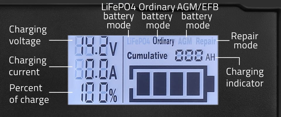 Inteligentna mikroprocesorowa ładowarka 12V | 12.6V | 24V |Prostownik z funkcją naprawy do akumulatora AGM GEL LiFePO4 | LCD