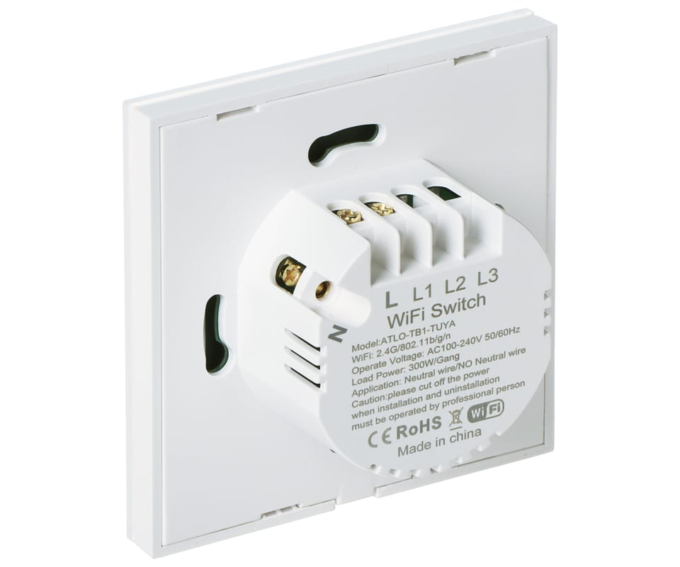 Przełącznik ATLO-TB1-TUYA umożliwia włączanie i wyłączanie oświetlenia bezprzewodowo poprzez aplikację lub przez panel dotykowyPrzełącznik może pracować w dwóch konfiguracjach zasilania: 1. przewód neutralny N jest podłączony do lampy i przełącznika (bez kondensatora) 2. przewód neutralny N jest podłączony tylko do lampy (z kondensatorem).Niezwykłą cechą tego przełącznika jest brak konieczności doprowadzenia przewodu neutralnego N, co powoduje, że może być stosowany w tradycyjnych instalacjach bez konieczności zmiany istniejącej instalacji elektrycznej.Do prawidłowego funkcjonowania urządzenia niezbędne jest połączenie go z siecią Wi-Fi z dostępem do Internetu
